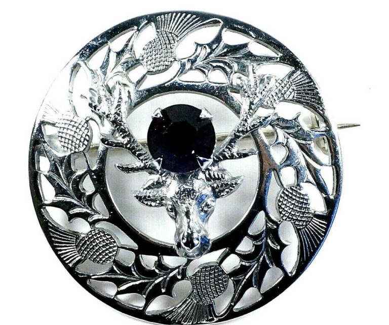 Vintage Scottish stag and faux amethyst rhinestone brooch by Mizpah. This beautiful brooch is formed from silver tone metal in a Scottish shield design set with a stag and a faux amethyst rhinestone.