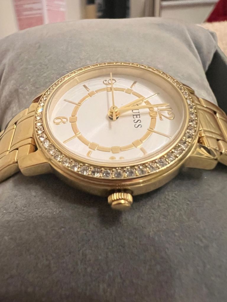 Guess Ladies Gold Tone Watch with Crystal Bezel – Boxed