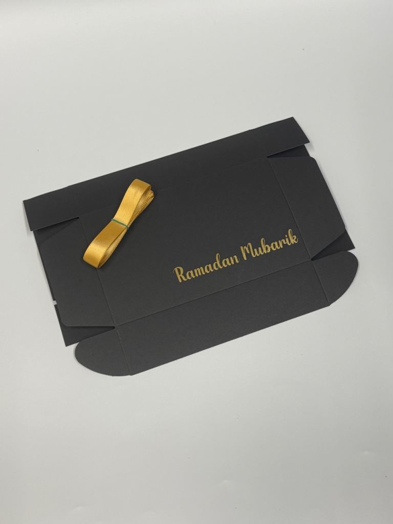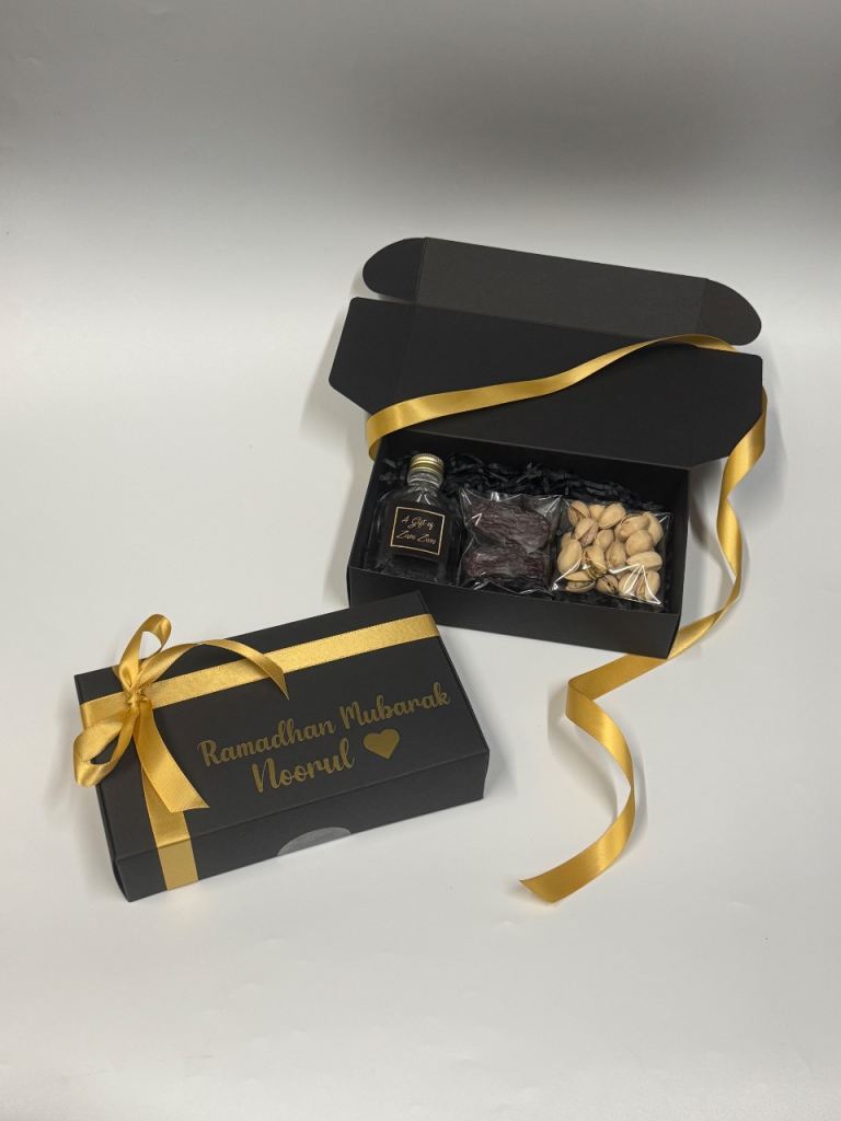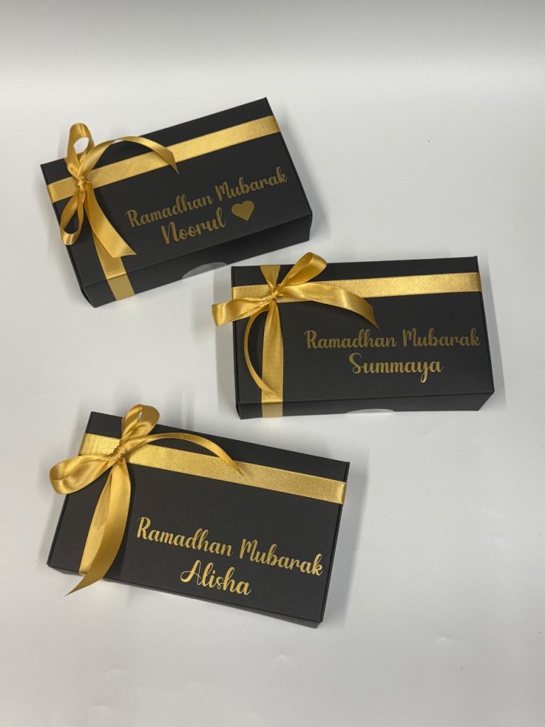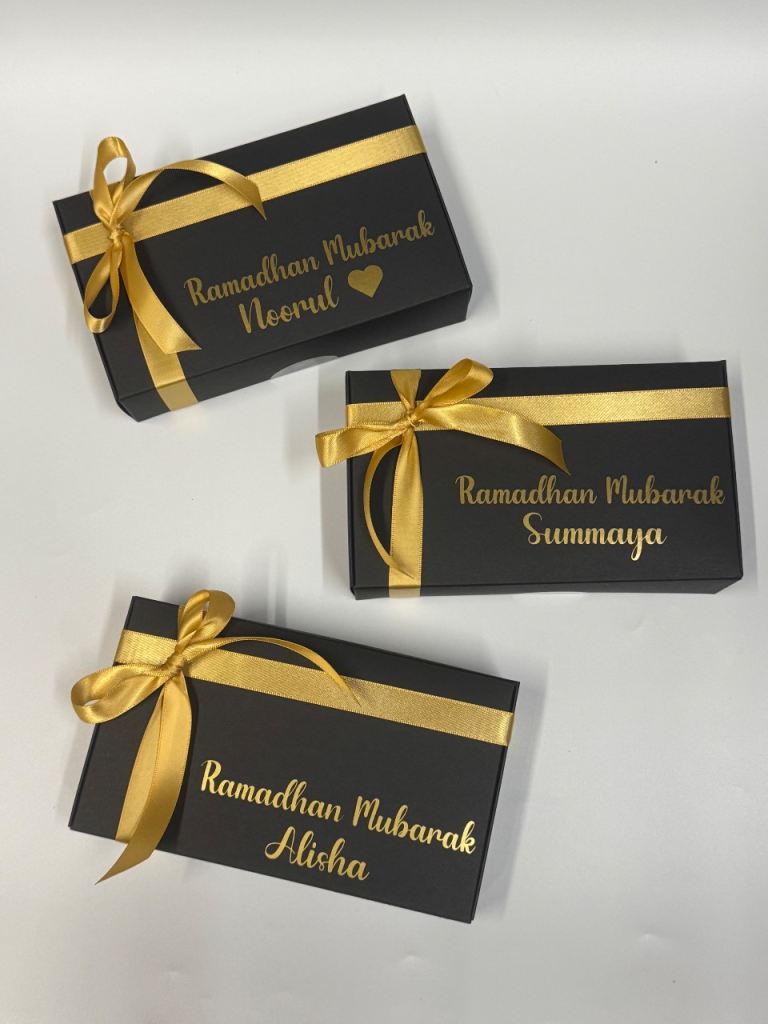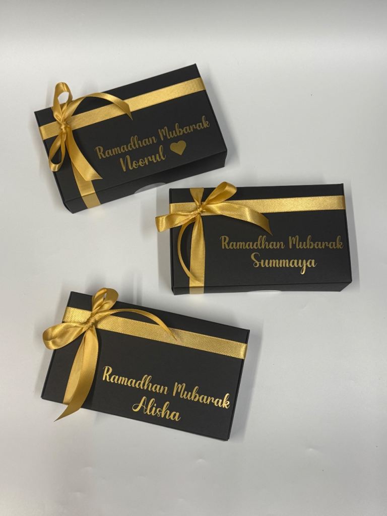 box will say ‘Ramadhan Mubarak’ but you can add a name too, please message at the time of ordering