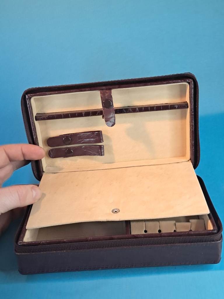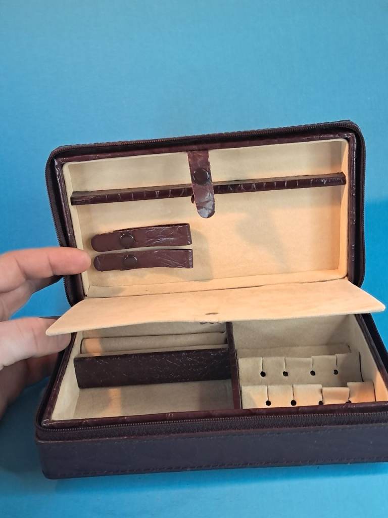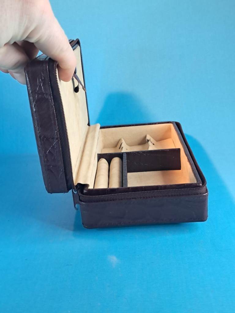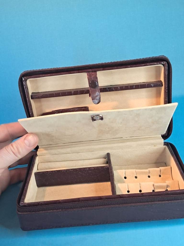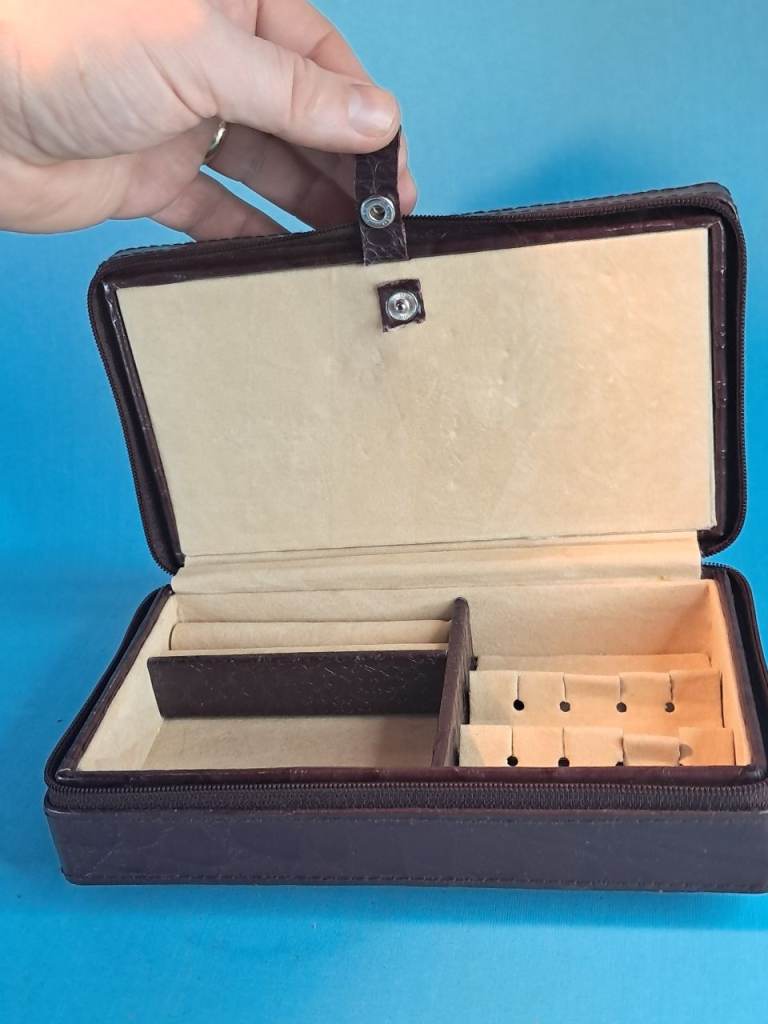 This is a Vintage brown leather travel jewelry box with a beige interior...