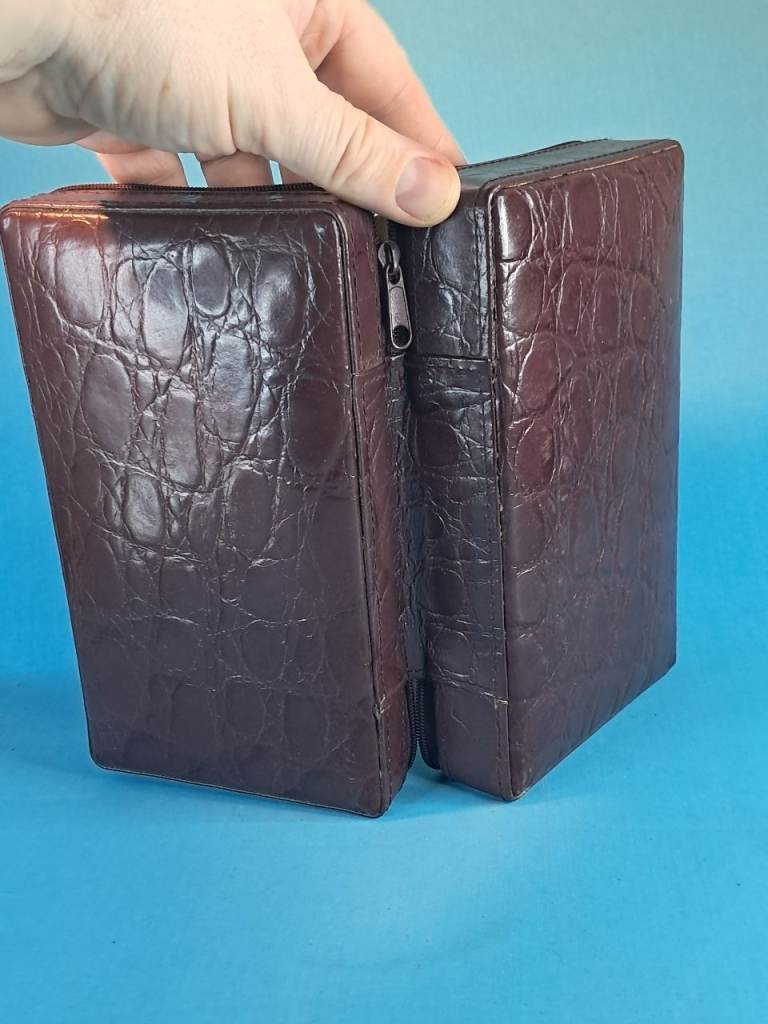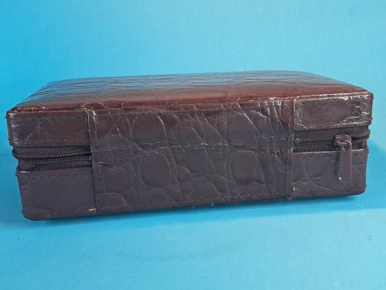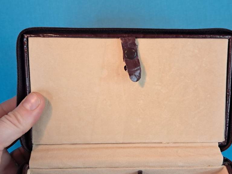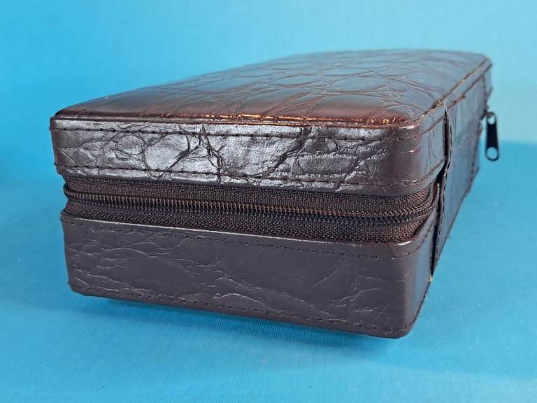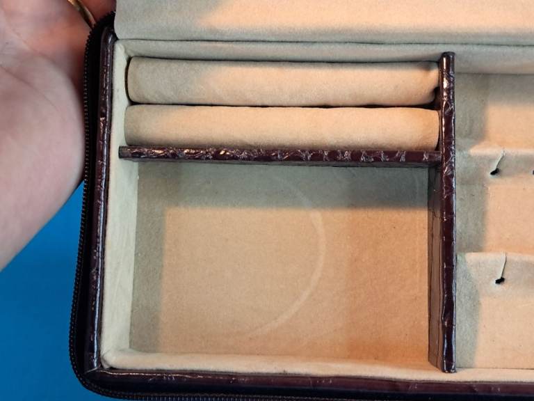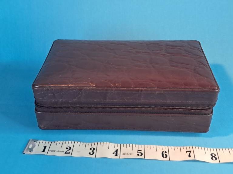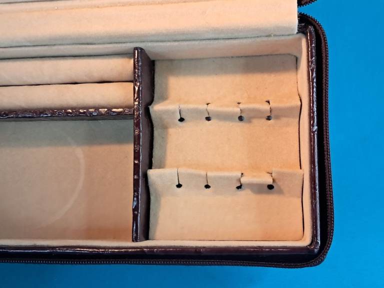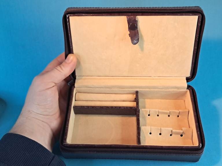 This is a Vintage brown leather travel jewelry box with a beige interior...