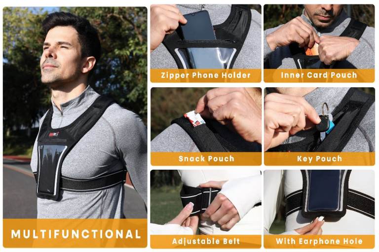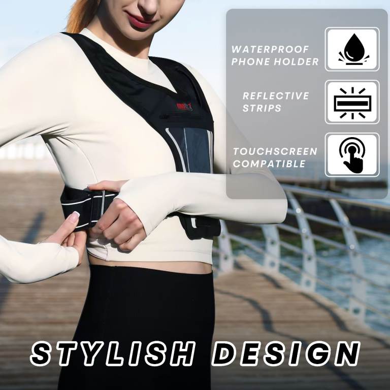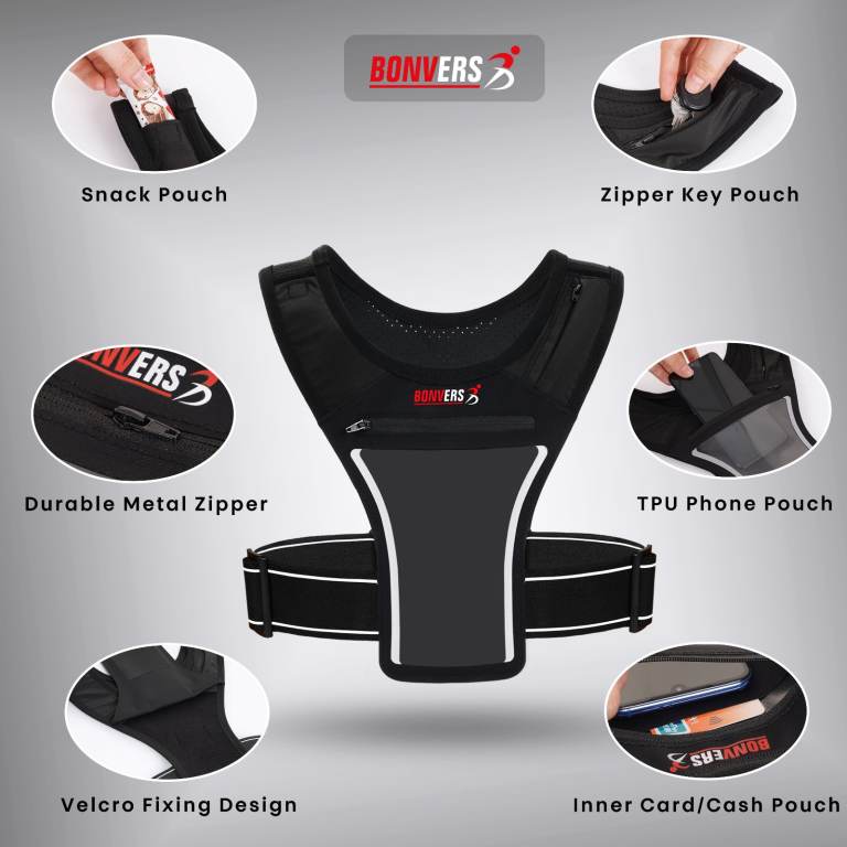 Say goodbye to cumbersome armbands and bouncing waist packs! The Bonvers reflective running vest is your lightweight and stylish alternative, designed for hands-free convenience. Compatible with 7.5” phones, the premium TPU phone pouch protects your device, while the breathable neoprene material ensures maximum comfort. Its durable metal zipper provides smooth and reliable access. Its phone pouch protects against sweat, dirt, and light rain while keeping your device fully functional. You can effortlessly access your apps, playlists, or maps without removing your phone using this chest phone holder vest. Engineered for active lifestyles, the velcro fixing design ensures your phone stays in place without bouncing or slipping. Whether you’re sprinting on city streets or hiking remote trails, this vest serves as a game-changing running gear, taking your fitness journey to the next level.
