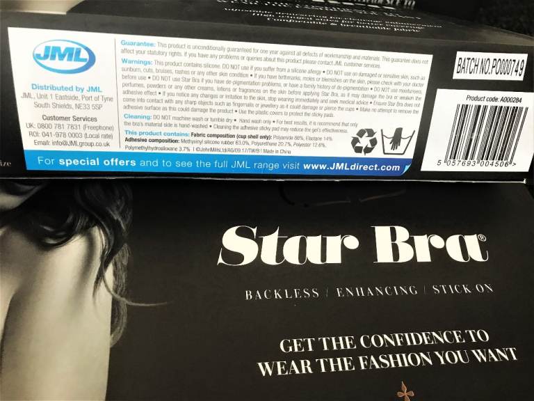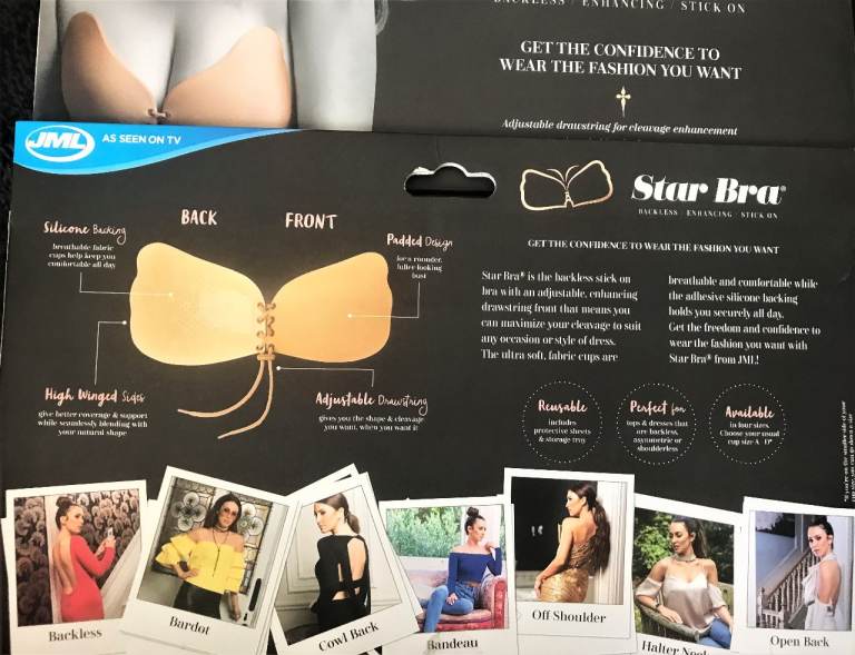 The JML Star Bra is a backless stick-on bra with an adjustable, enhancing drawstring front that means you can maximise your cleavage to suit the occasion. The ultra-soft, fabric cups are breathable and comfortable while the adhesive silicone backing holds