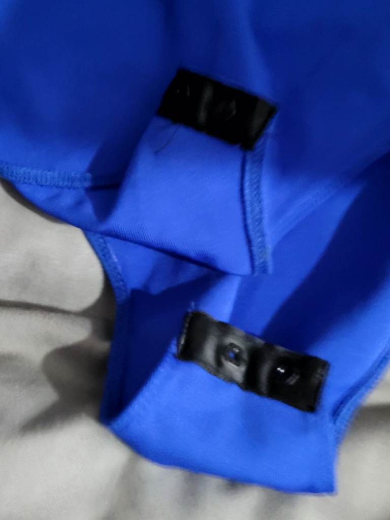 This eye-catching preloved bodysuit is a vibrant, bright royal blue, not dark blue. It features a classic high-cut, sleeveless leotard style with convenient snap fastenings at the base. The material is smooth and stretchy, making it an excellent choice for dance, gymnastics, cosplay, or as a statement base layer for fashion outfits.