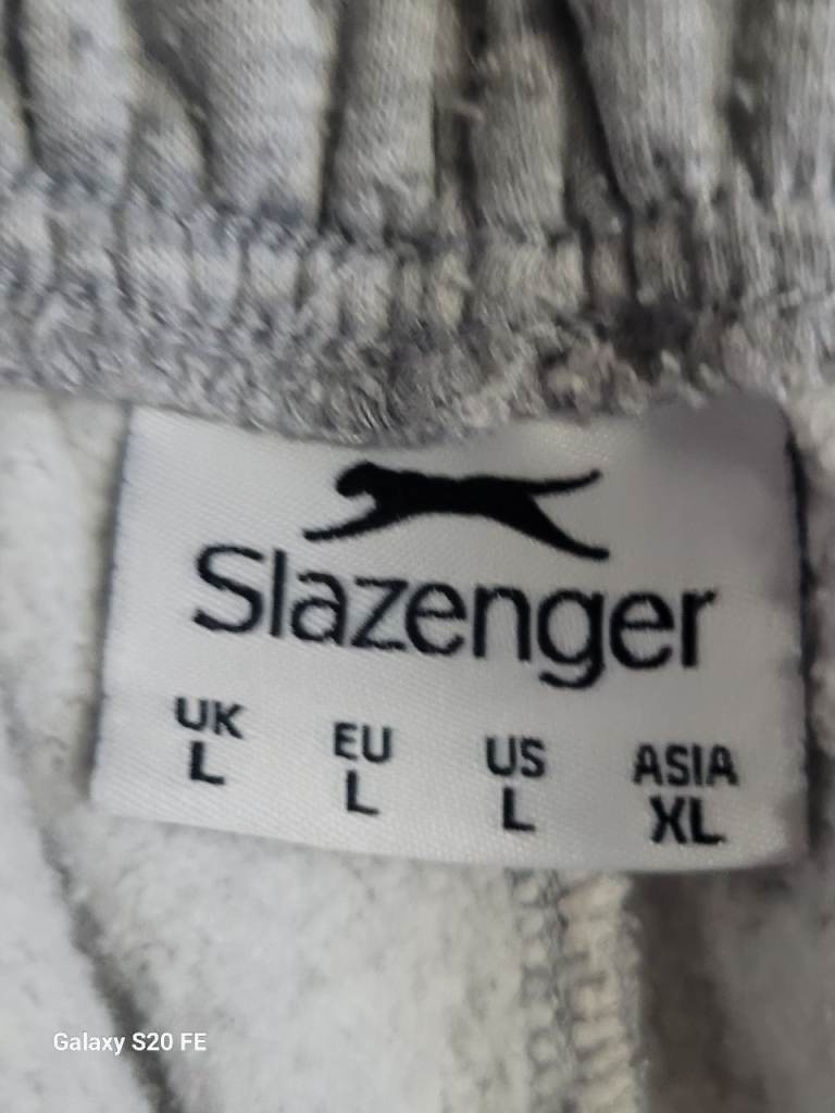 This is a pair of used Slazenger joggers or sweatpants in a comfortable gray fleece material. The size is Large (L) for UK, EU, and US sizing, with an Asia size XL.