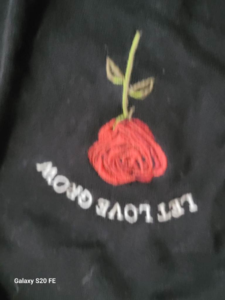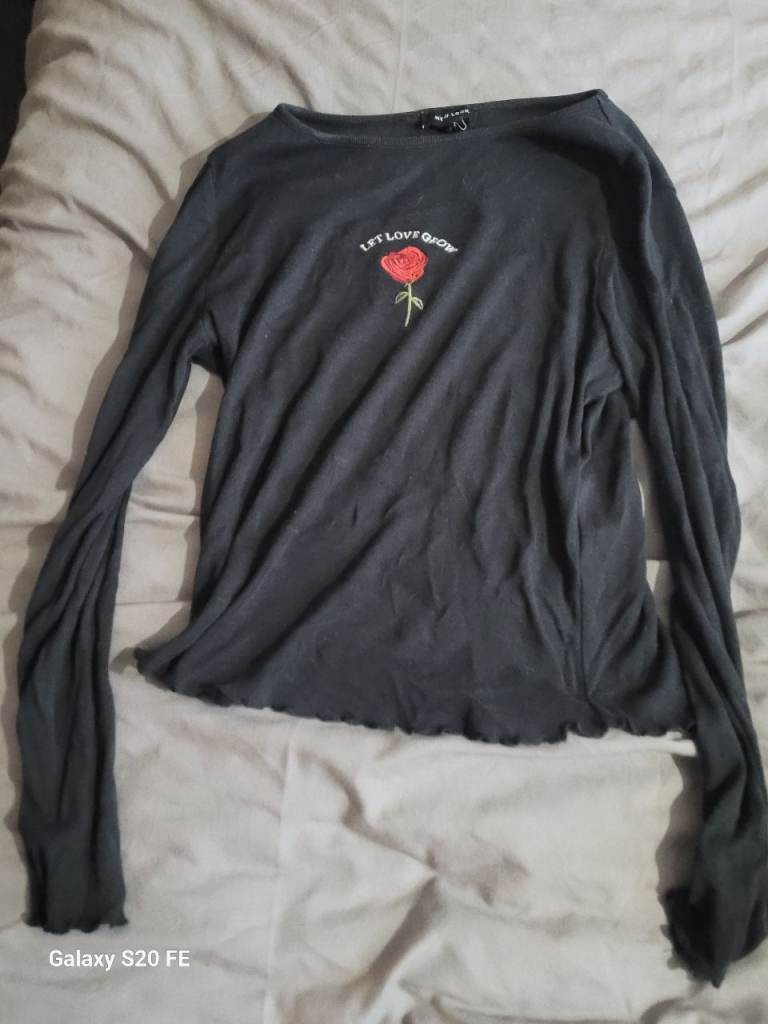 This is a used New Look long sleeve black top in size UK 12 (EU 40, US 8). This top is unique with an embroidered red rose and "LET LOVE GROW" text on the chest.