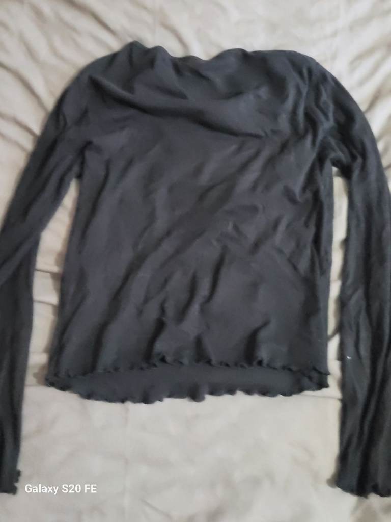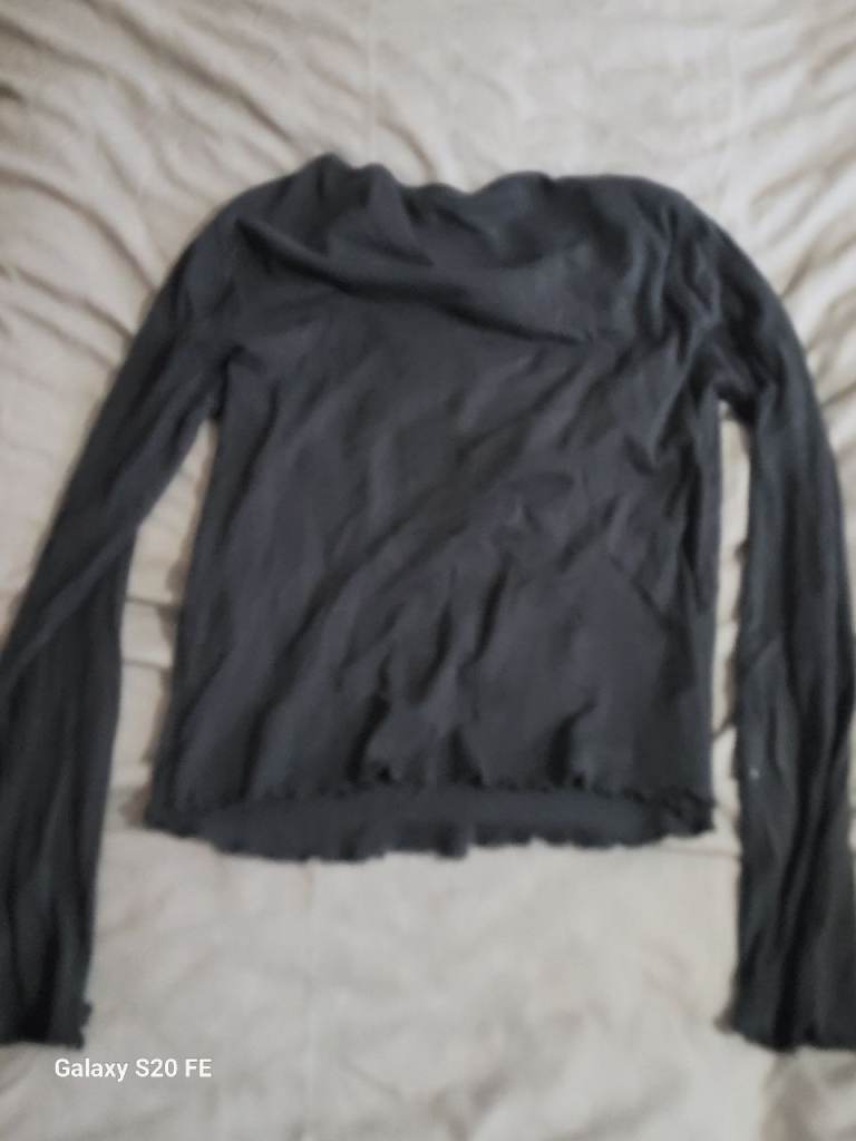It features a stylish lettuce edge or lettuce hem trim along the cuffs and bottom, adding a feminine touch. It has a slight boat or wide neckline. It was made in Turkey.