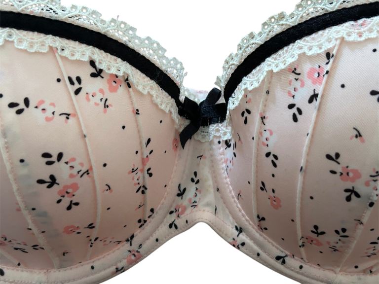 Womens No Secret Balcony Underwired Bra Pink Floral Black Bow Lace Detail Size 36C