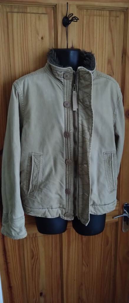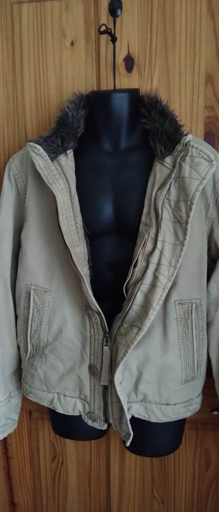 In decent condition apart from a stain on sleeve which would need covering with a nice sewn on badge or symbol , fabric marker pen even. Apart from that it is the quality of Abercrombie & Fitch.