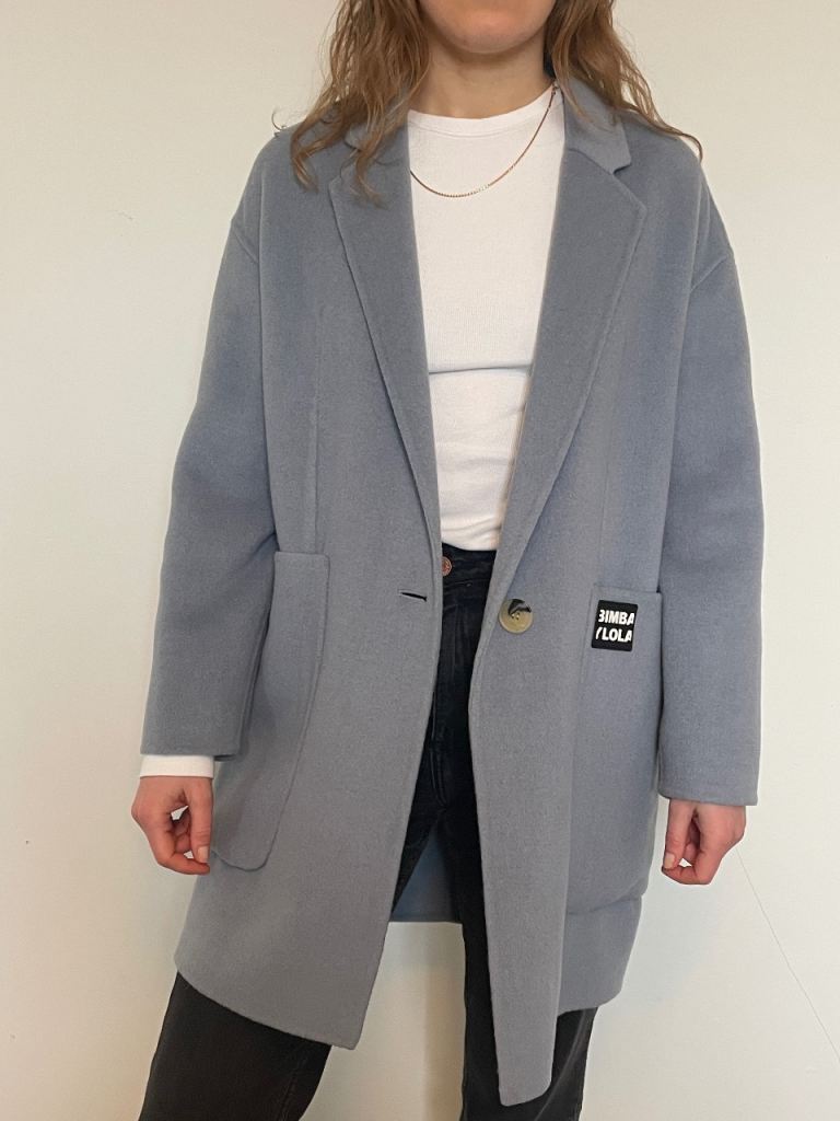 Powder blue coat from Bimba Y Lola. Size XS loose fitting style - comes down to about mid-thigh (I’m 5ft 5”).