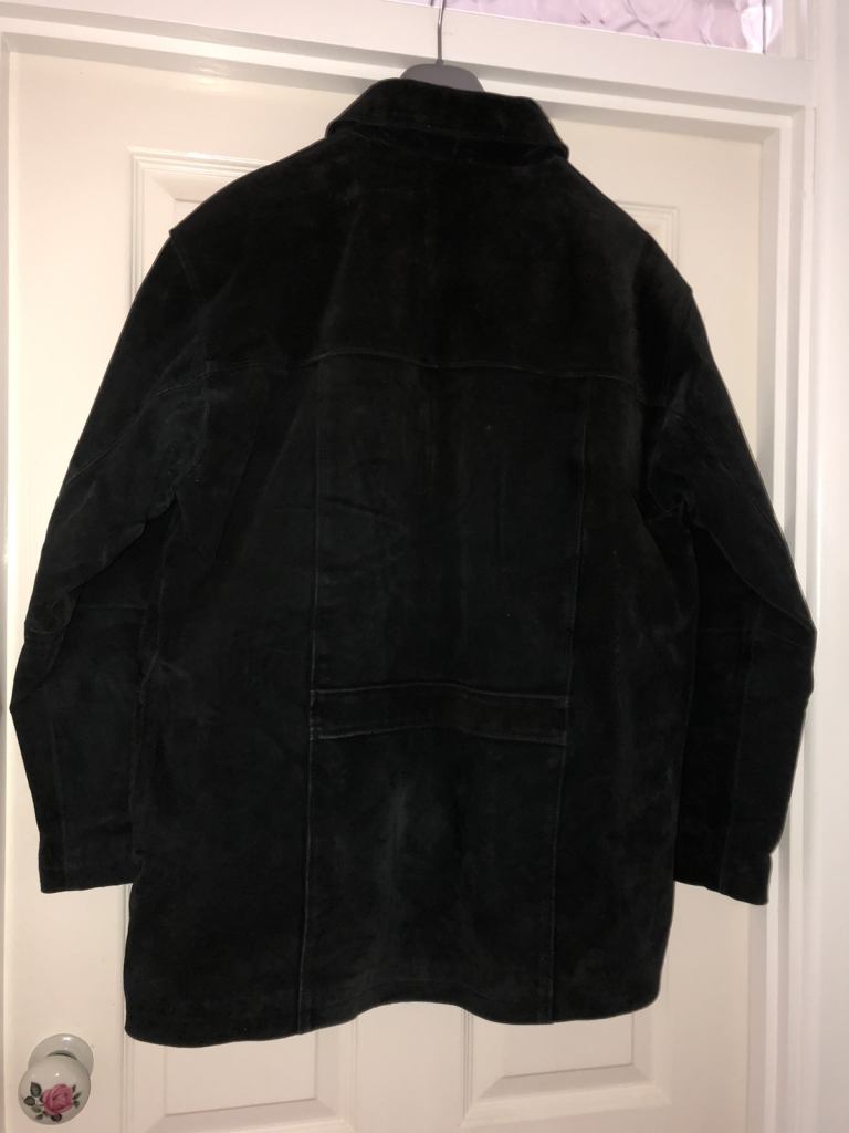 Ladies black suede box jacket. Zip fastening. Chest size approximately 44”. Length 30” centre back. Good condition.