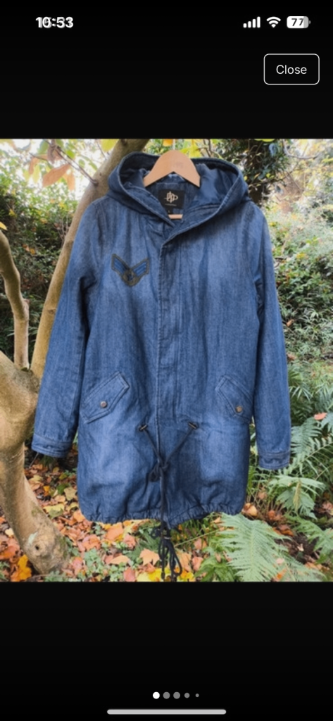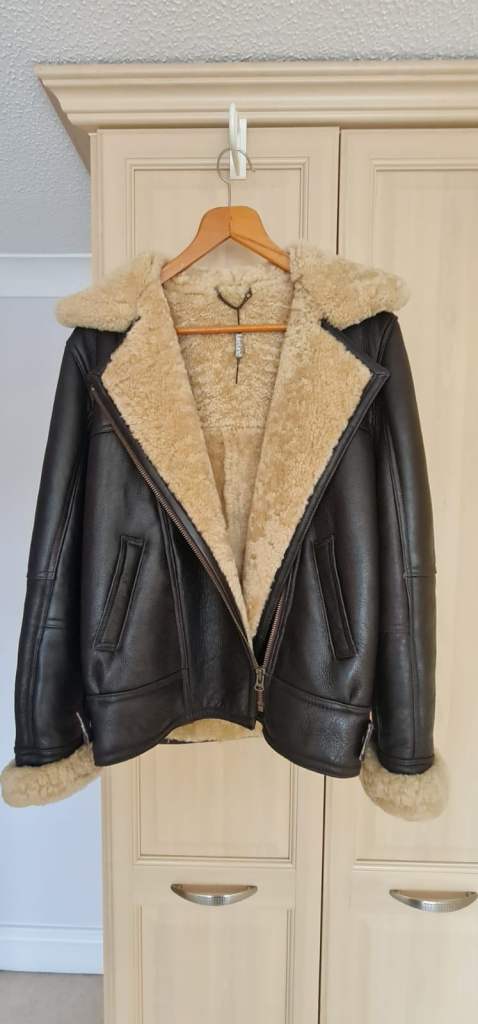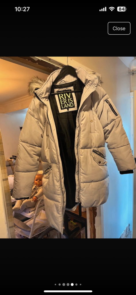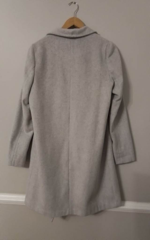Nice knee length coat in light grey, warm with two pockets size 10 that would fit someone upto size 14 as the style is an open coat. Unfortunately the photographs doesn't do it justice as collar needed to be folded more which would be easier done when on.