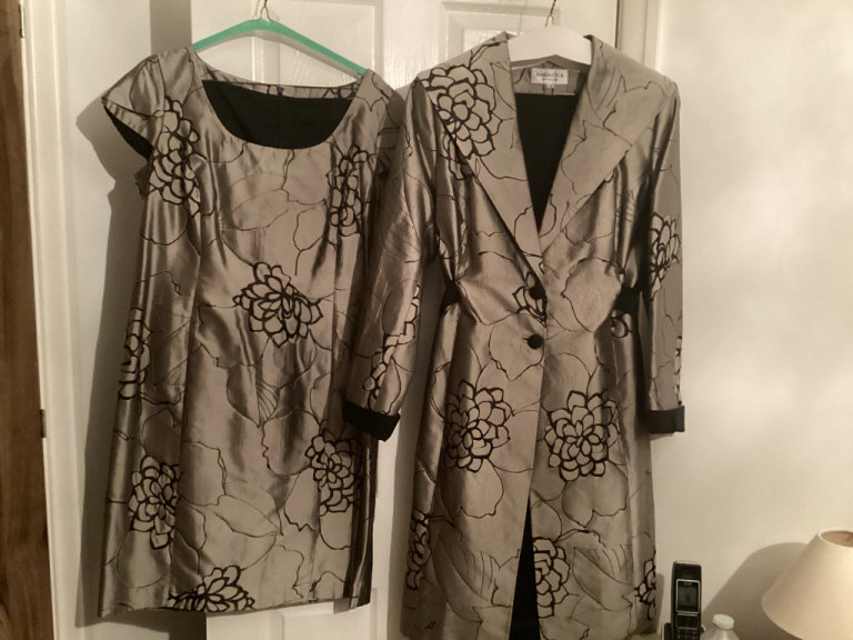 Maria coca designer mother of the bride shift dress and matching coat. Size 12 The coat looks great over plain black evening trousers. The dress also looks great as a formal dress. The suit has been dry cleaned and is ready to wear. Selling for £100.00