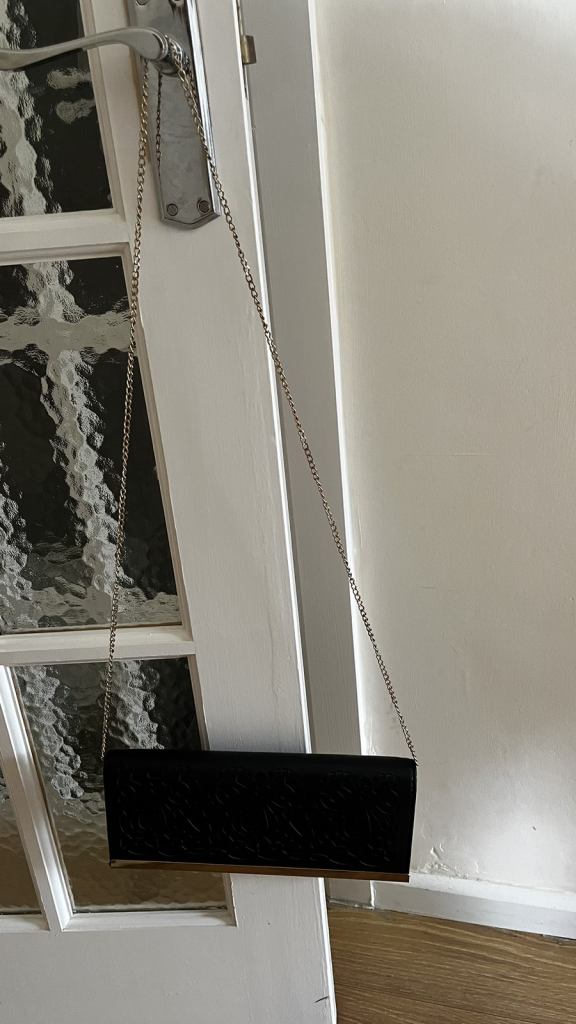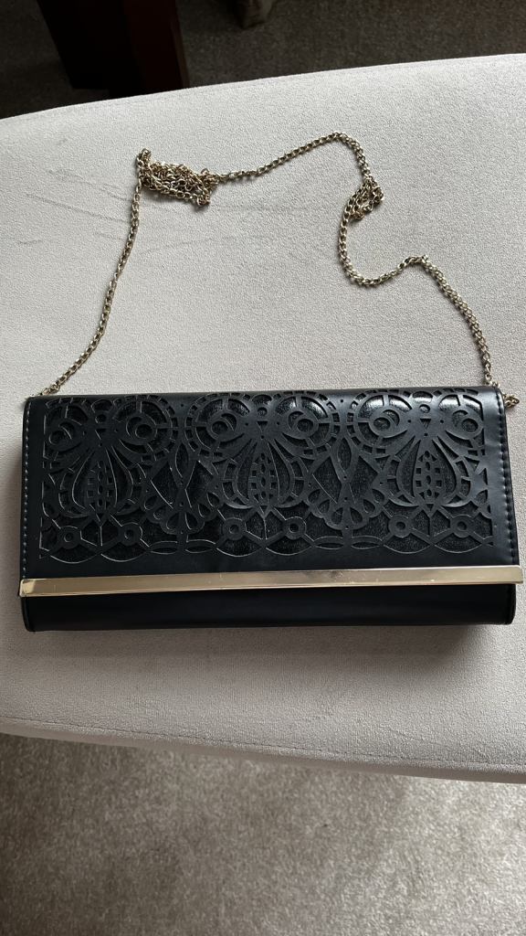 Black clutch & shoulder bag, with a cut out pattern on the front and a gold strip and shoulder strap, from New Look. Excellent condition, from smoke free and pet free home
