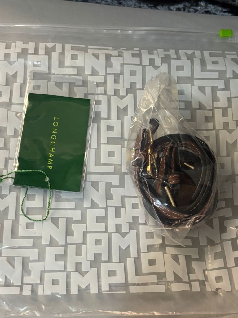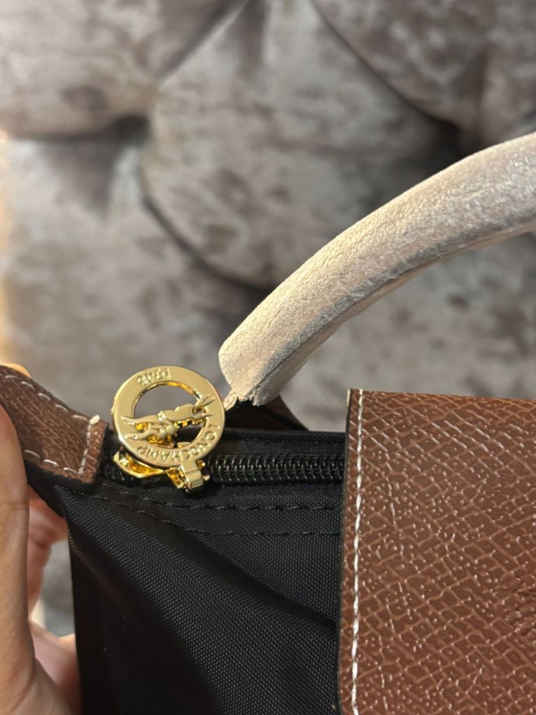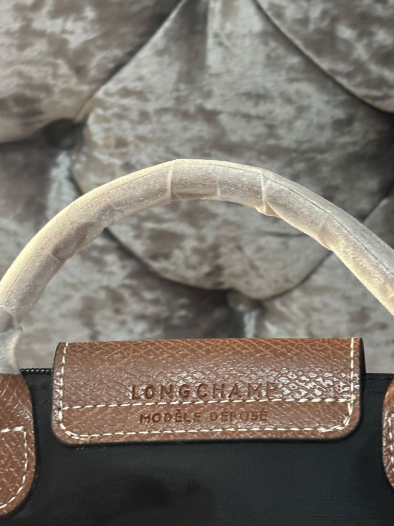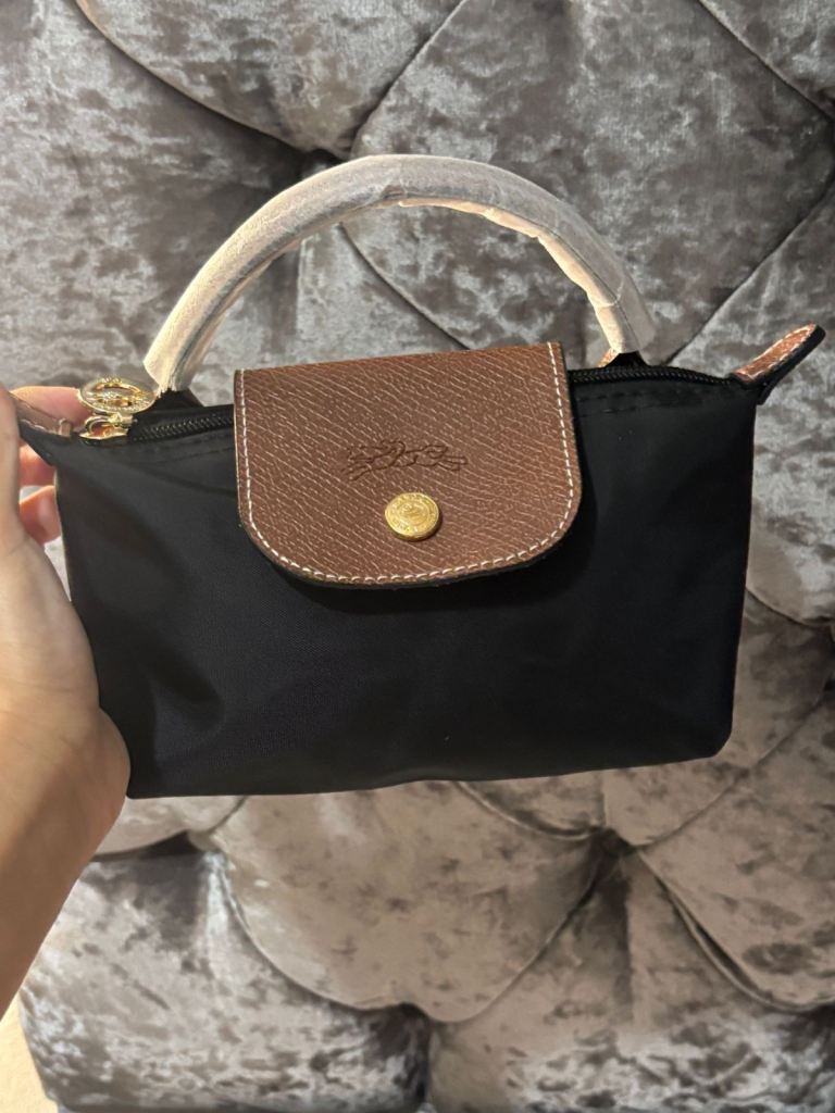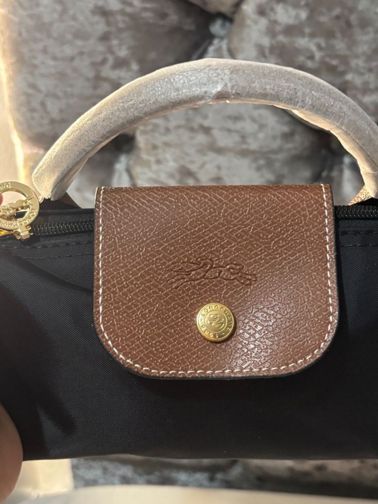 Longchamp mini handbag in classic black with brown leather flap and handle. Features gold-tone hardware and secure zip-top closure. Compact yet practical, perfect for everyday essentials or evening use.