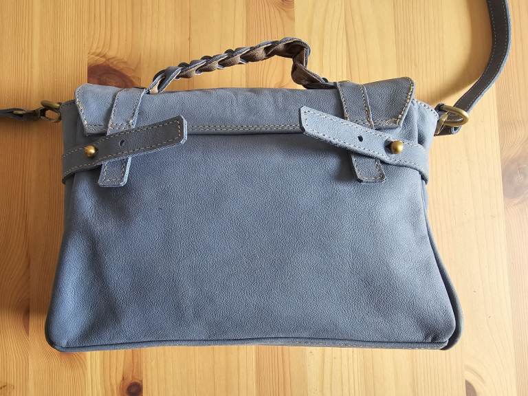 New blue leather satchel handbag with brass-tone hardware. This bag has a structured flap-over design with a twist-lock clasp, decorative buckle straps, and an adjustable shoulder strap. It also has a small top handle, giving you the option to carry it by hand or crossbody.