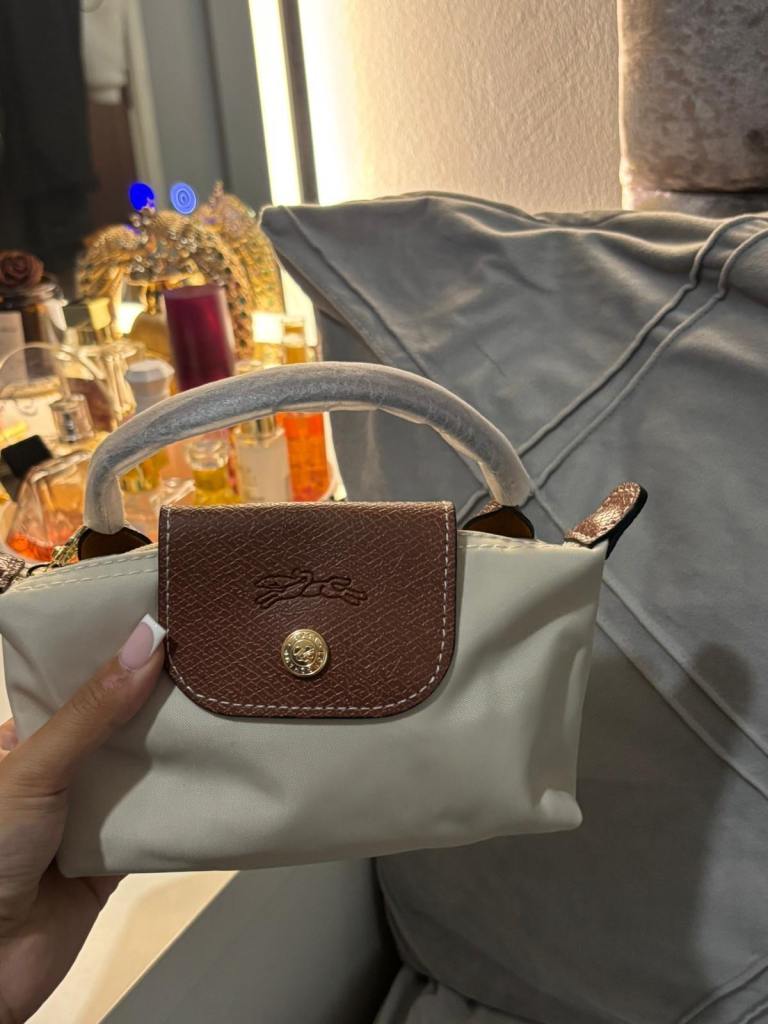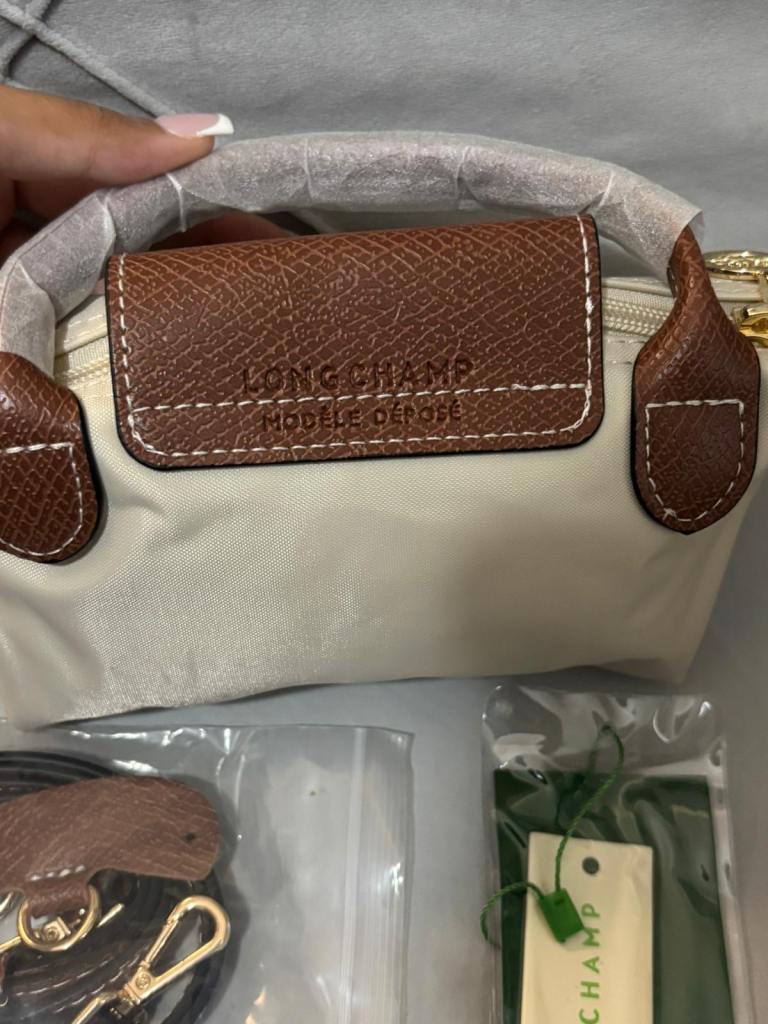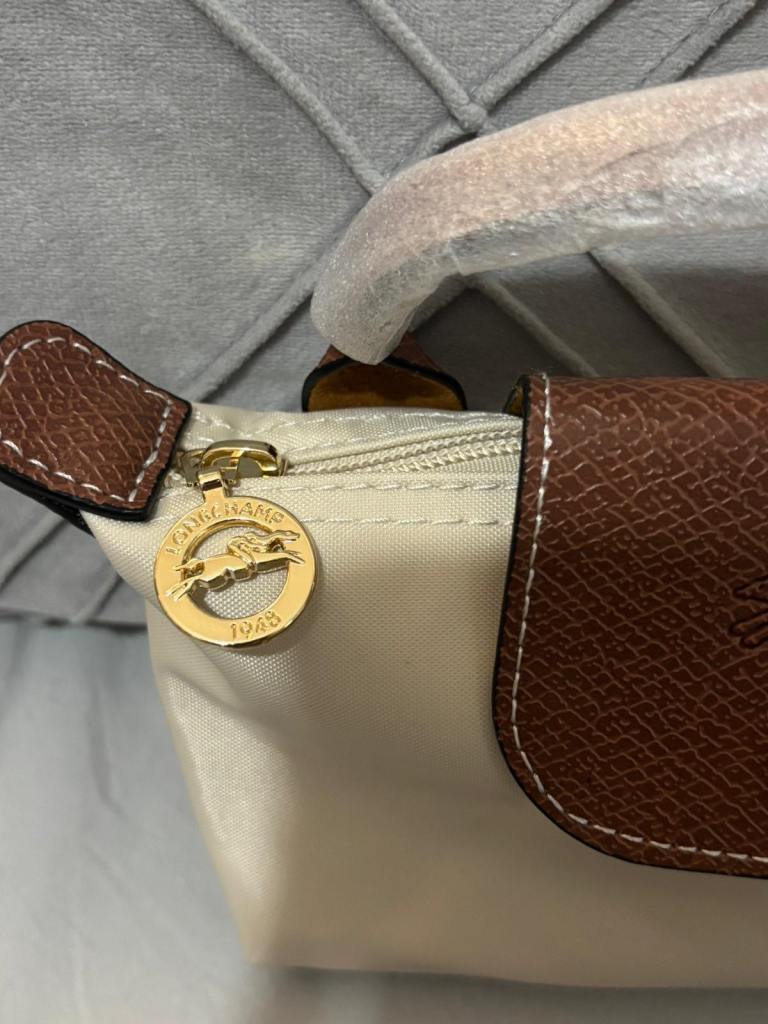 Longchamp mini handbag in classic creme with brown leather flap and handle. Features gold-tone hardware and secure zip-top closure. Compact yet practical, perfect for everyday essentials or evening use.