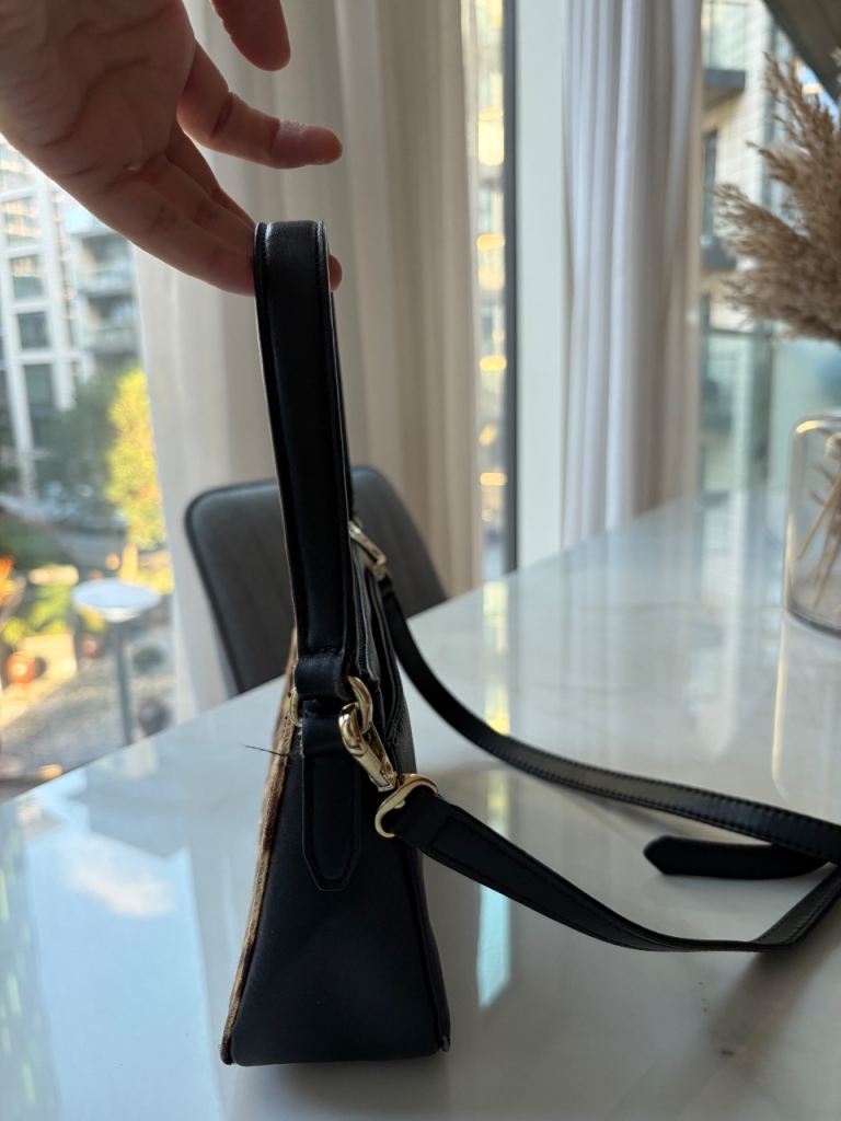 Cute DKNY bag in a leopard/monogram mix. Perfect size for everyday use. Zip closure, lined inside, and sits nicely on the shoulder.