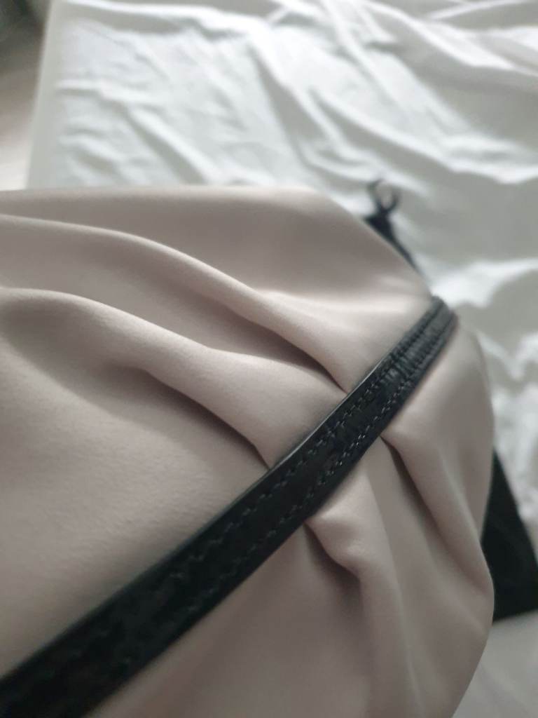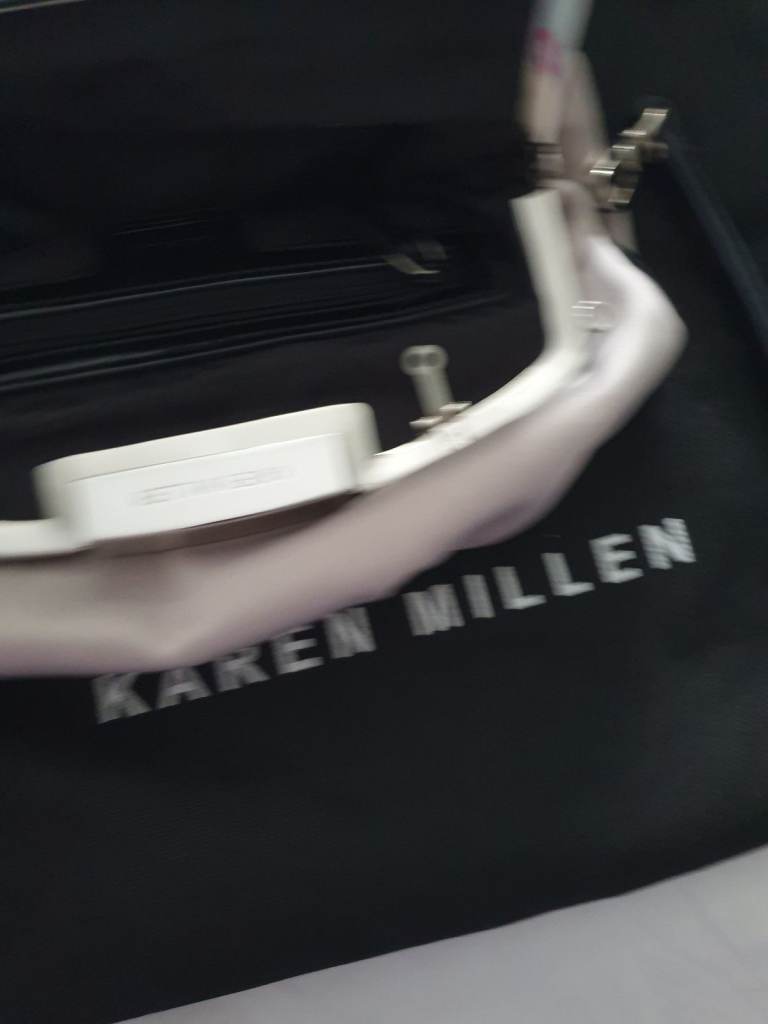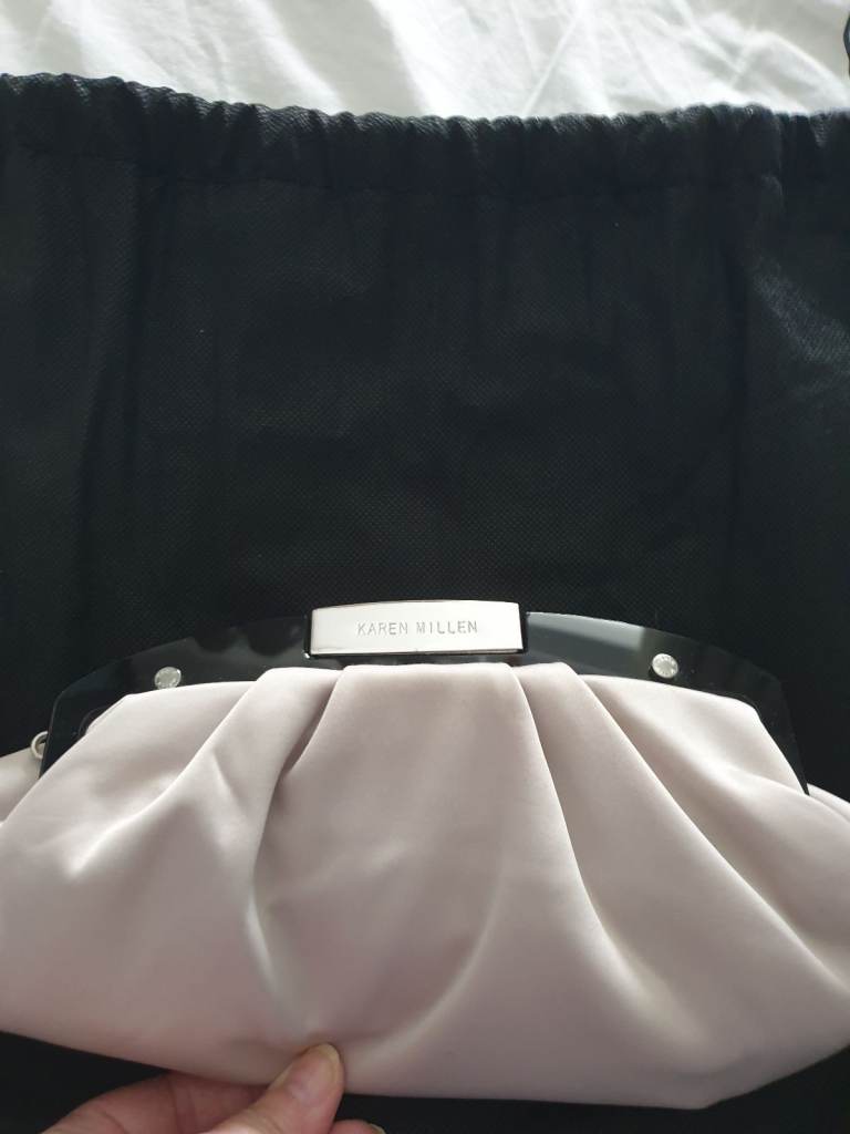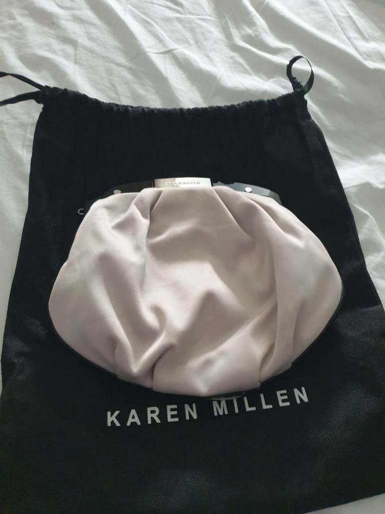 Karen Millen evening, event, occasion clutch bag. Soft satin material comes with detachable hand/wrist strap. Netural colour. Large enough to fit a mobile + some makeup. Lovely looking bag, in fab condition, with storage bag. Only use once. Perfect for the hoilday season 🎄