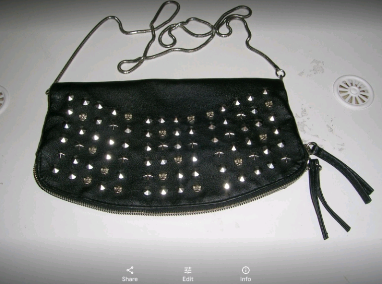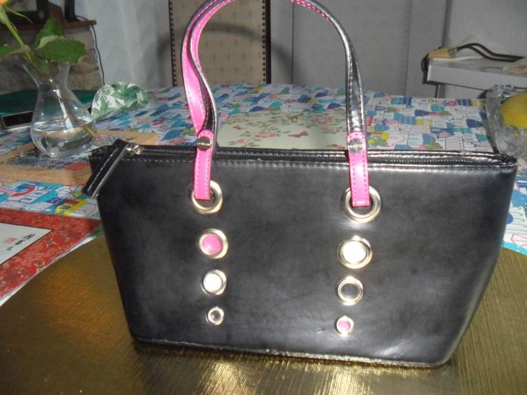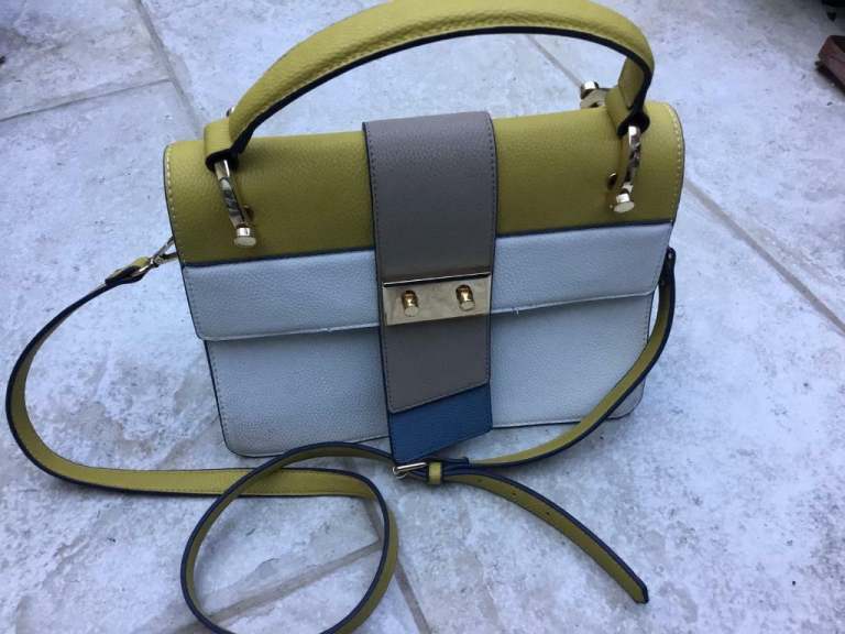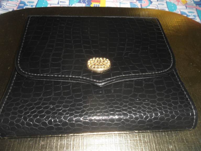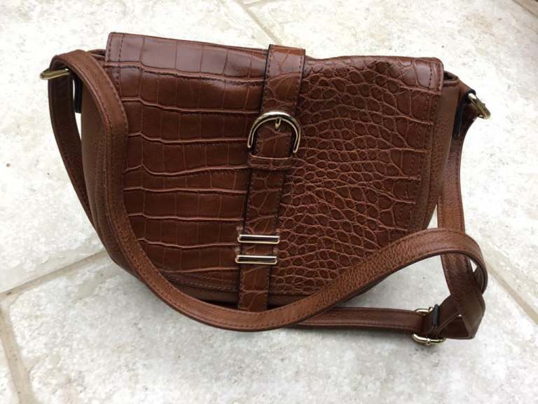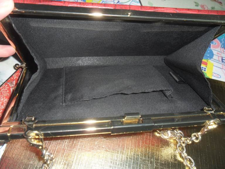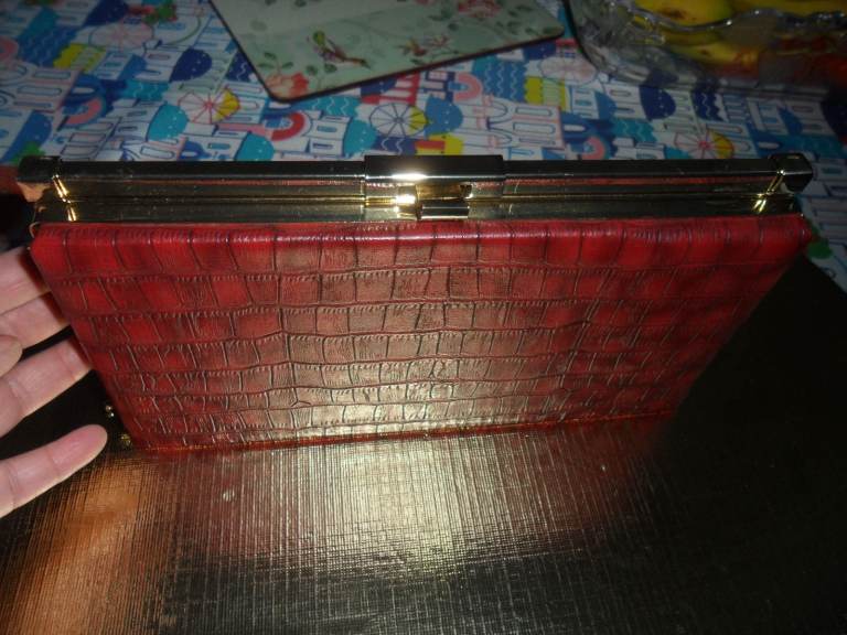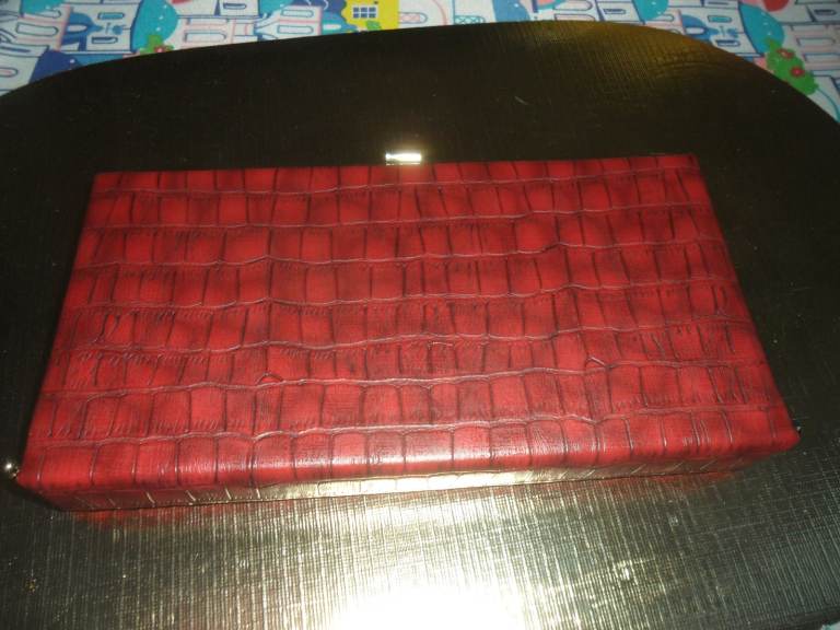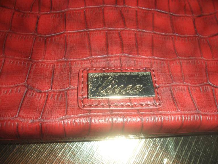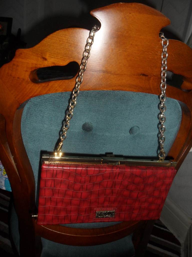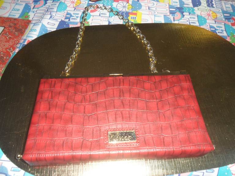 Lovely , smart looking ladies medium size shoulder /clutch bag in a reddish with a hint of brown colour. It has a detachable gold metal chain which makes it look classy. Can be use as a clutch or shoulder back. Made y Linea a trusted brand.