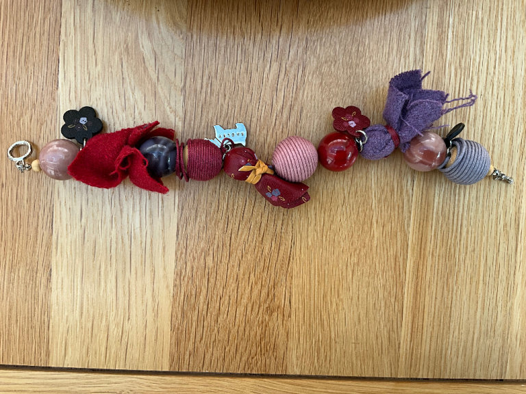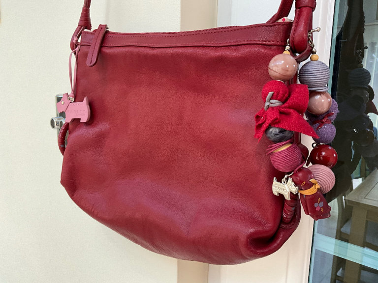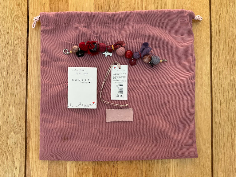Matching separate bag attachment or bracelet of an assortment of different coloured glossy and corded covered balls, including the silver Radley dog