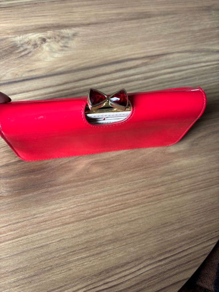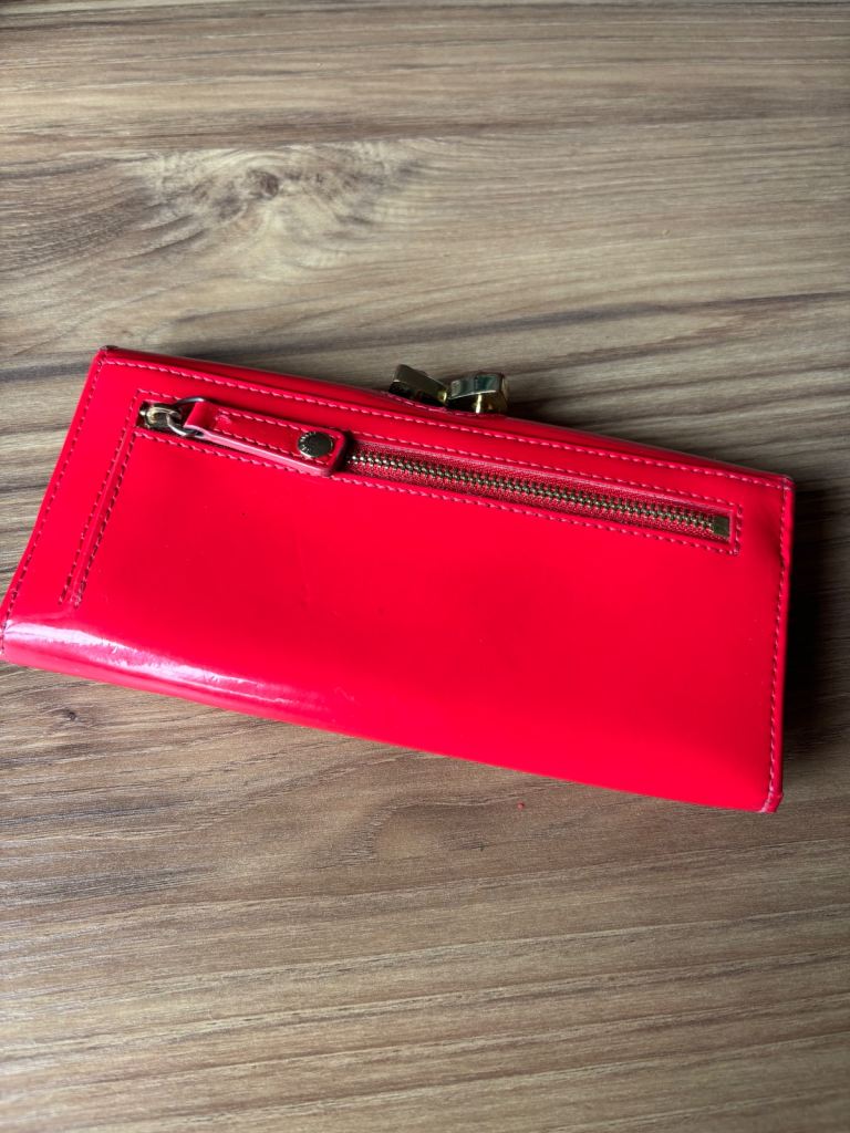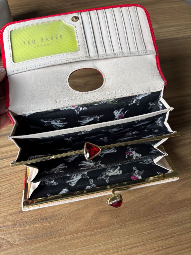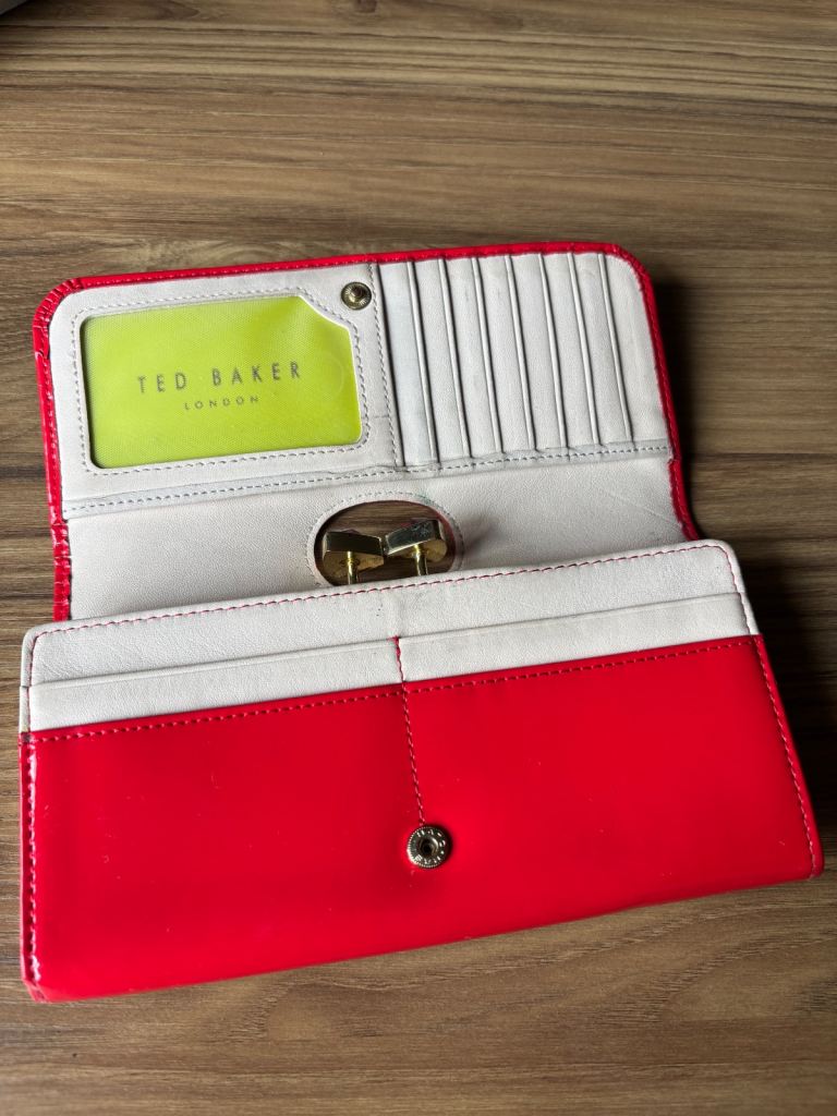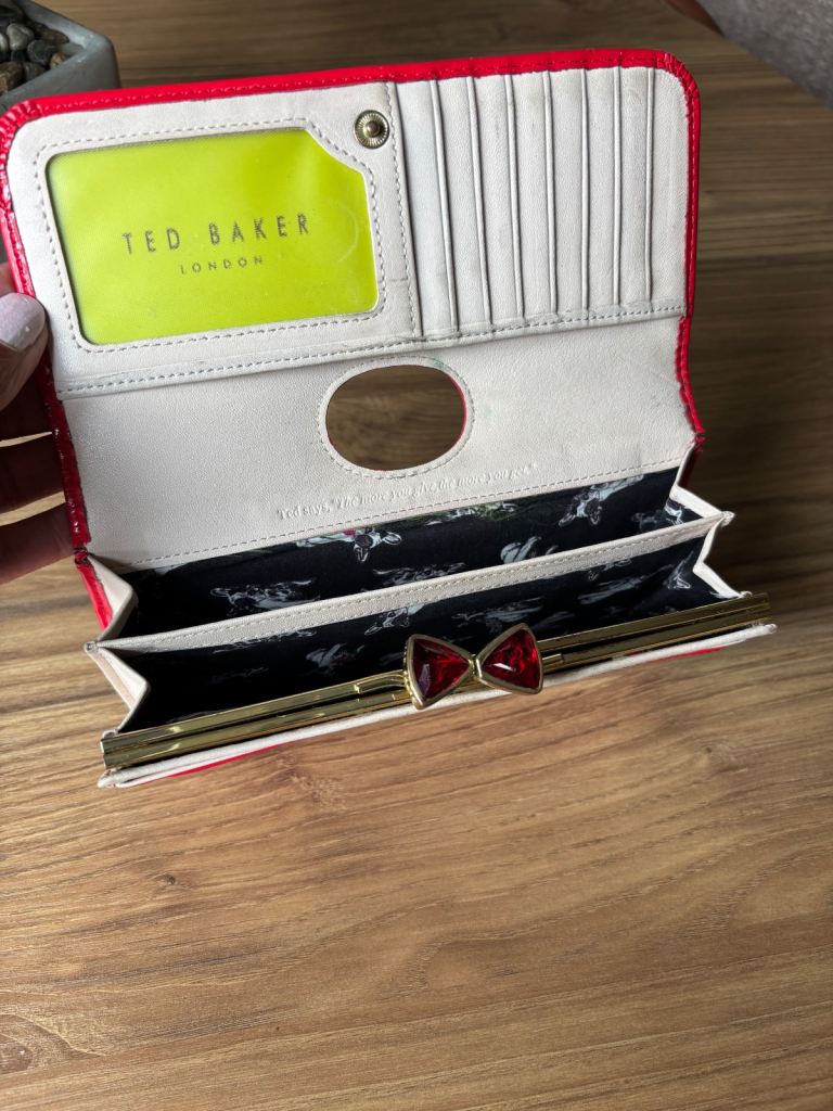 Ted Baker ladies large red patent purse. Large compartments inside with plenty of space for credit cards and coins. Useful large zip compartment at the back. Beautiful red crystal clasp close with gold metalwork
