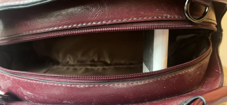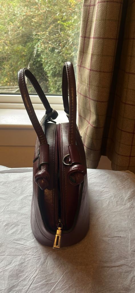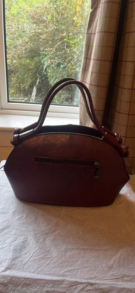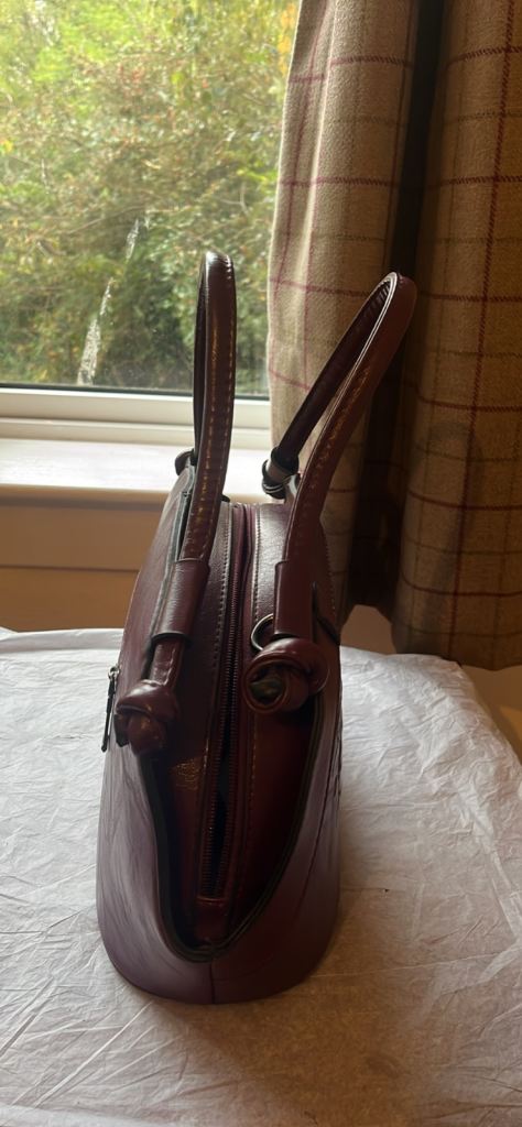 a burgundy or maroon leather-like material. It is a top-handle bag with a semi-oval shape can deliver