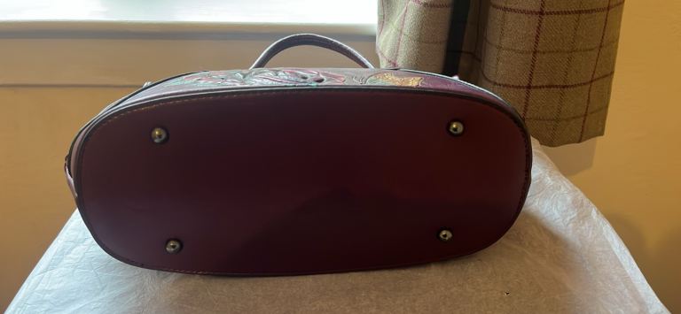 Posting for 9+ yearsThe handbag is a vintage or vintage-style item characterized by its embossed rose and butterfly desi