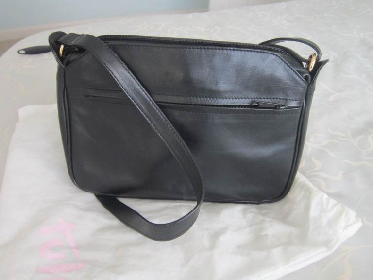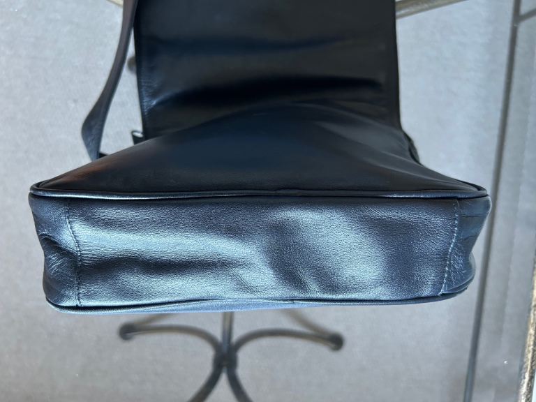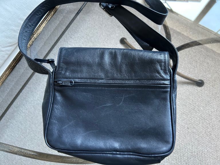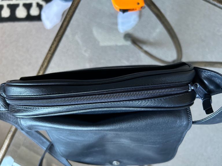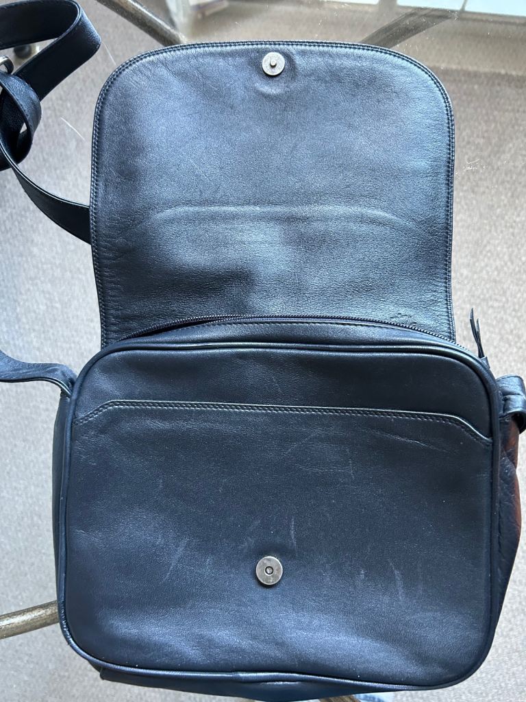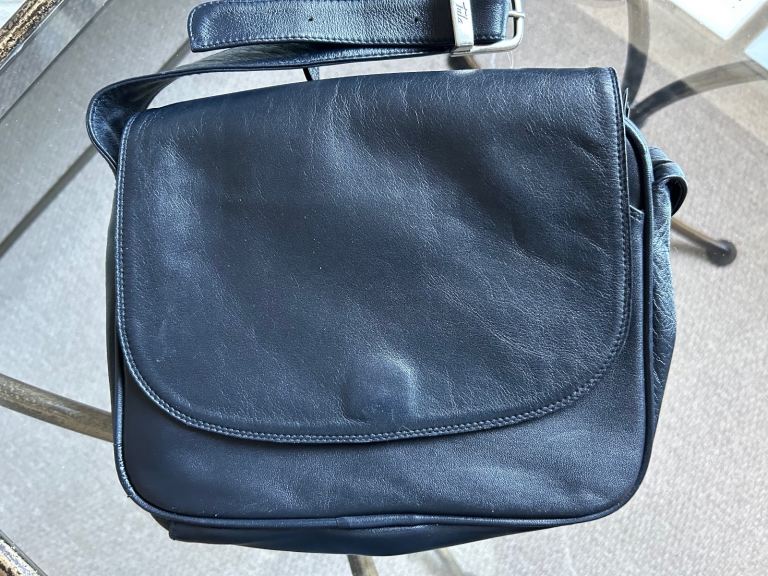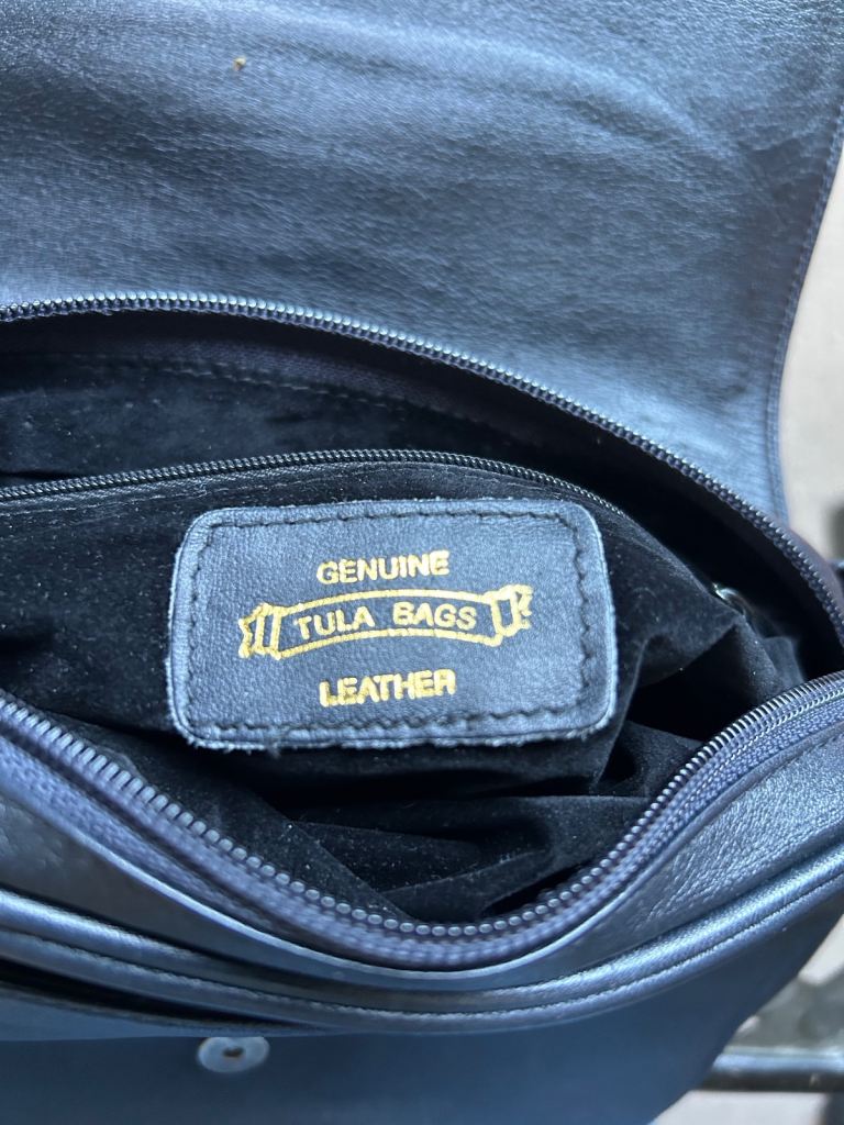 Lovely Tula navy leather bag In good condition. 25cm x 20cm. Clean interior. Magnetic stud on underside of flap which opens to another inside pocket. Then a zip across the top of bag, a zip compartment inside another zip compartment on the back.