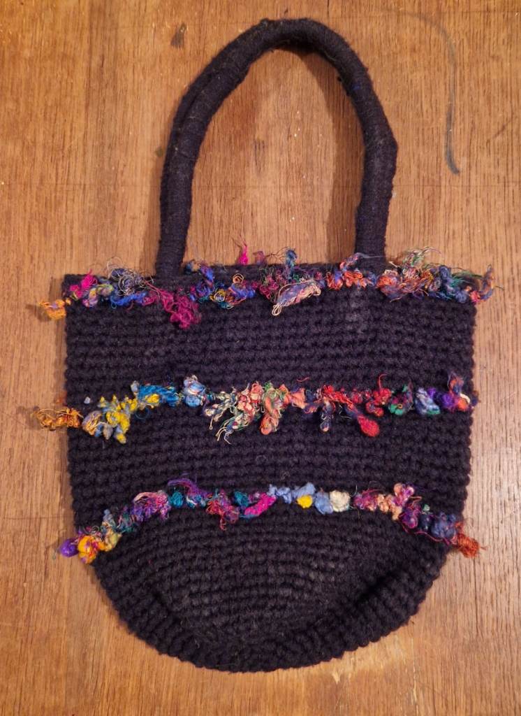 Vintage Small Hand Crochet Bag, Woollen with Raw Silk Stripes
