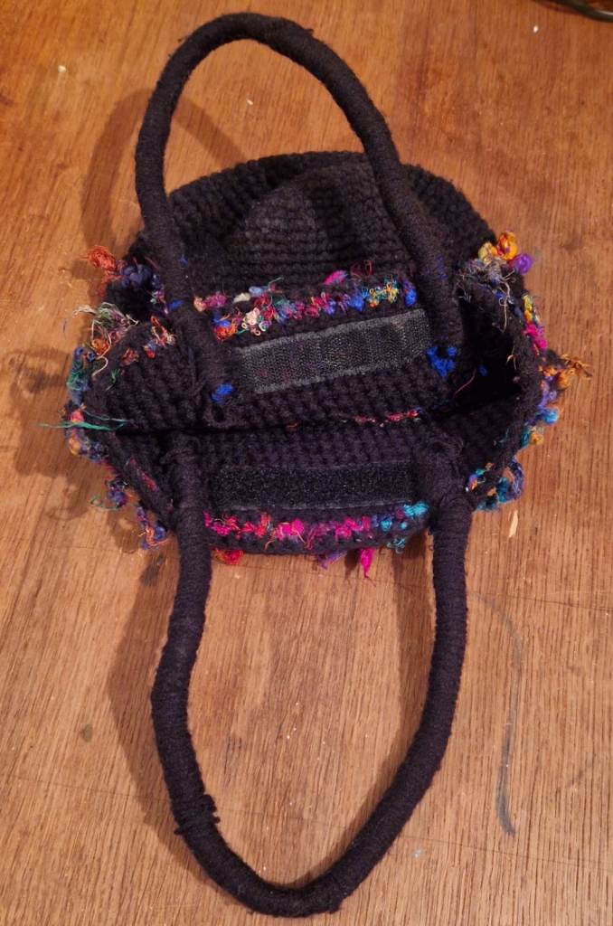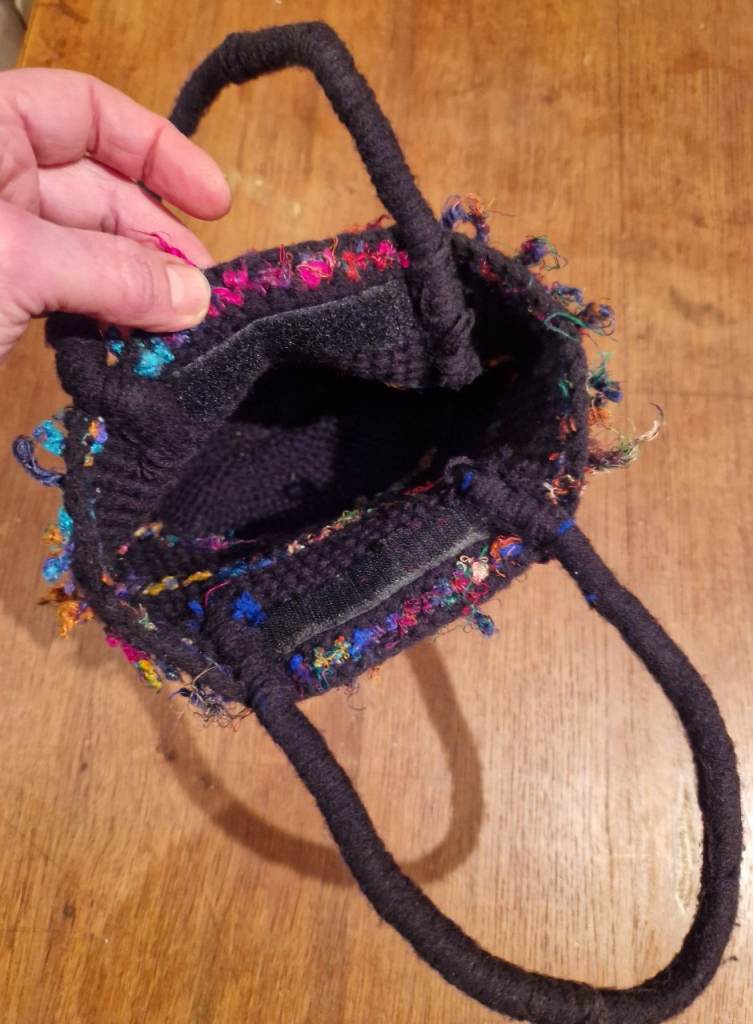 I bought this gorgeous little hand crafted bag years ago but never found the occasion to use it. Am emigrating soon so would love it to find a new home. I said it's wool, but there is no label so I can't be sure if it's a synthetic mix, and feels like it may be. But the coloured stripes are raw silk. It has valcrove closure at the top on the inside. Would make a lovely present for the right person.
