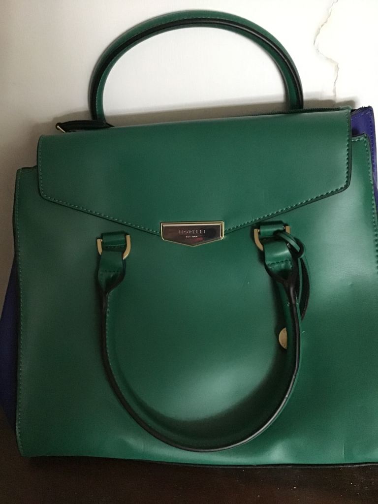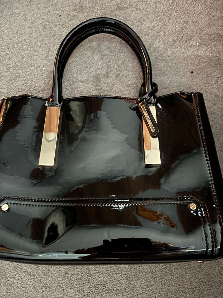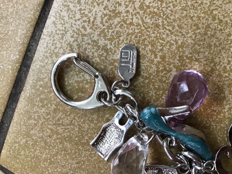 Silver hardware and detachable chain to change into a shoulder bag. Slide pocket on back.