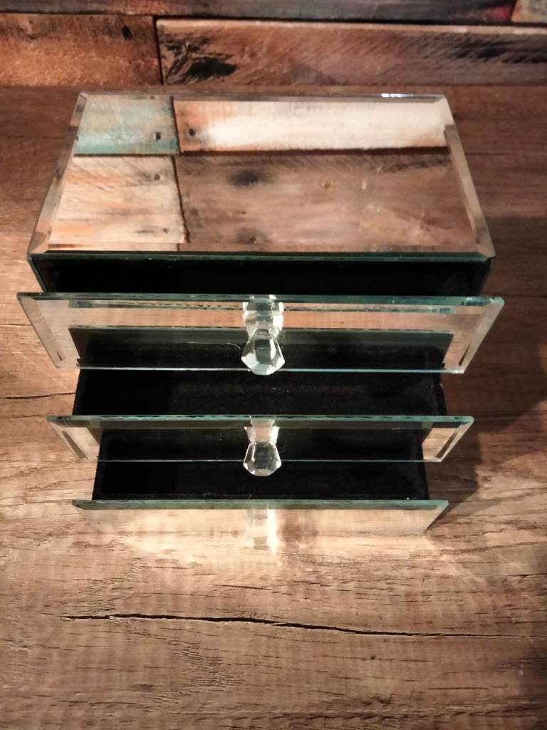 A mirrored glass jewellery box or cosmetic organizer 16.5 x 11.5 x 14 cm
