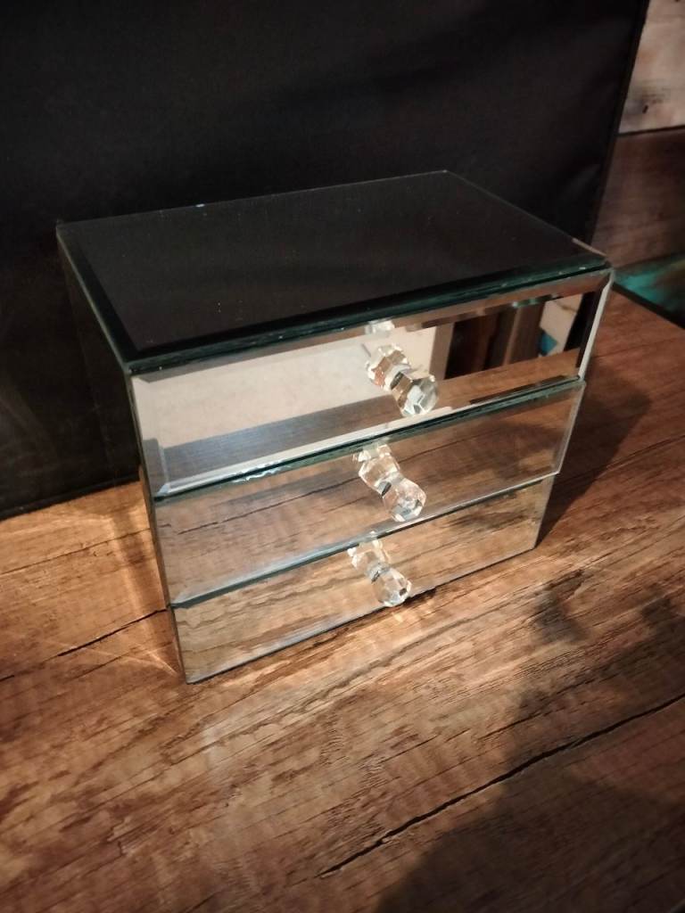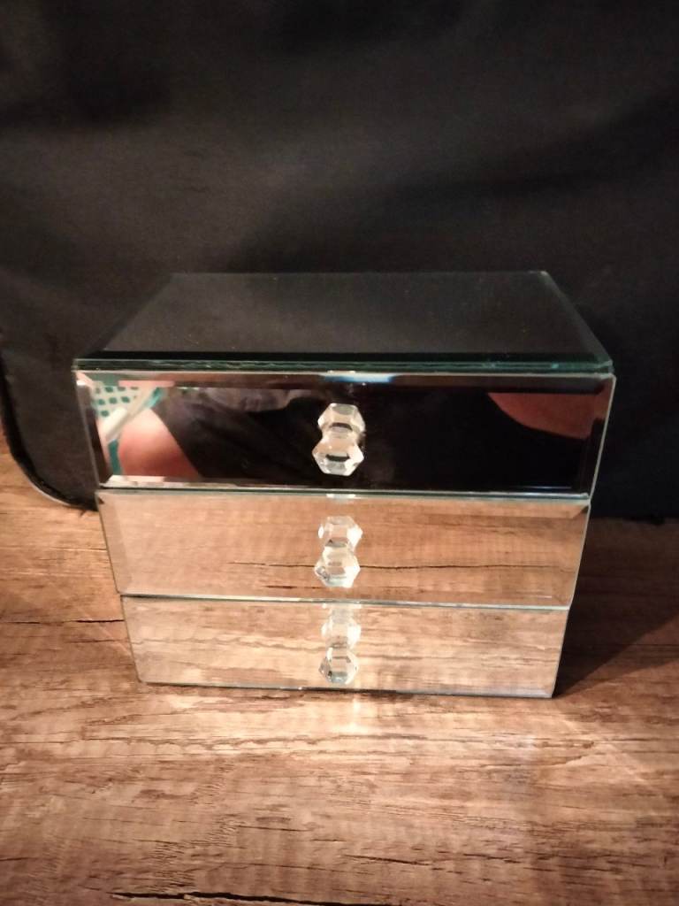 This item is a mirrored glass jewellery box or cosmetic organizer, typically featuring three drawers with crystal-effect handles. It serves as a stylish storage solution for small accessories like jewellery or makeup.