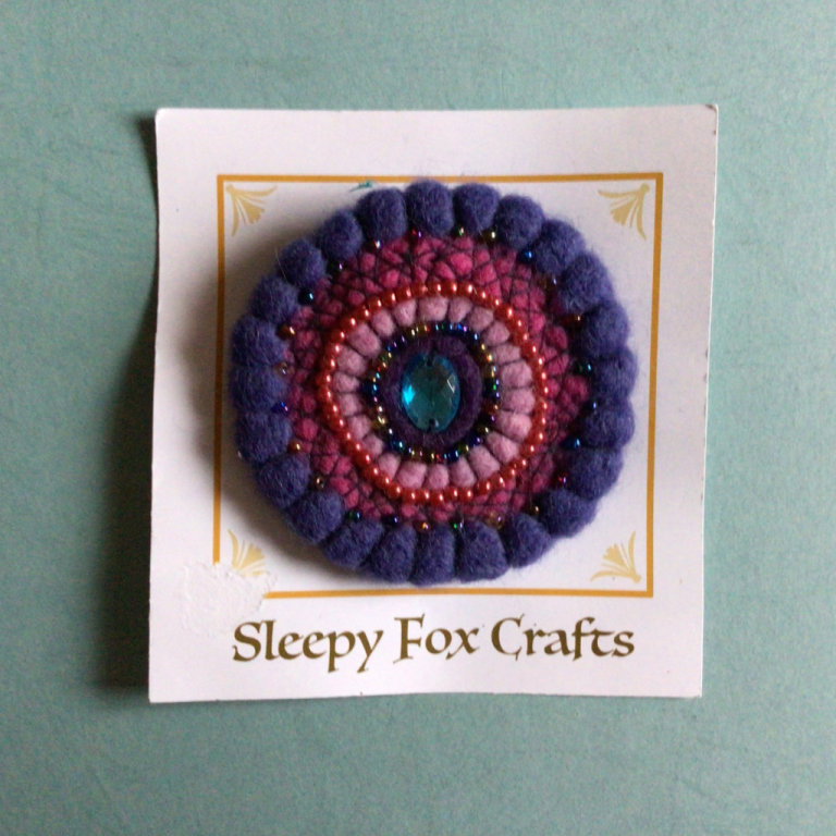 Handmade brooch made with merino wool, and embellished with beads and zip pieces