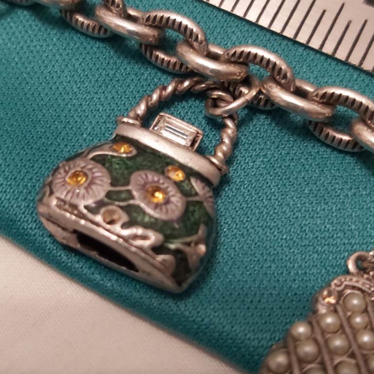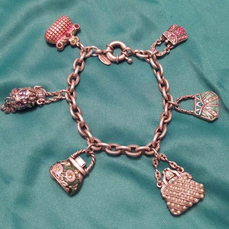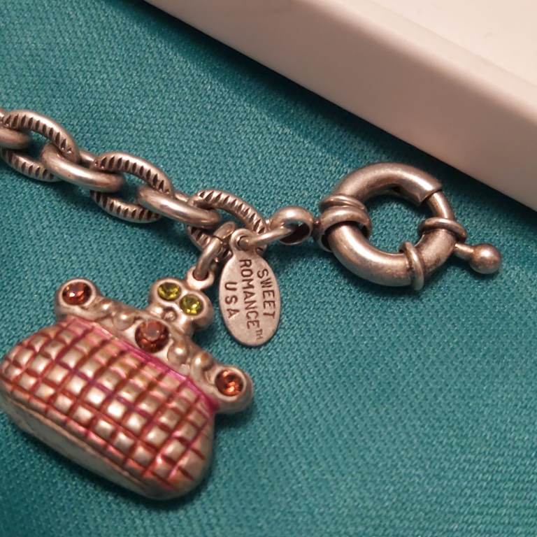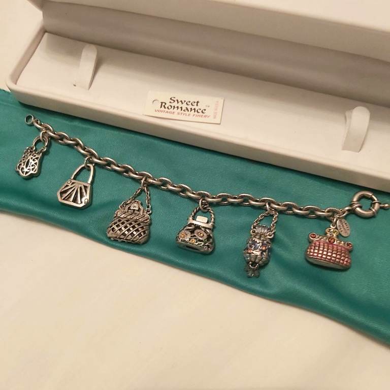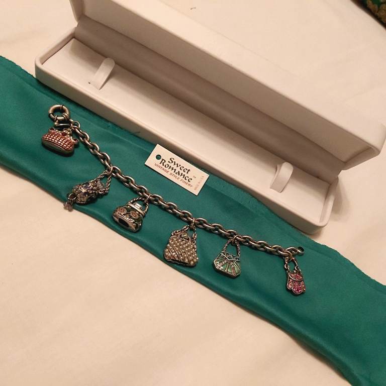 Beautiful Sweet Romance charm bracelet made in the USA with 6 charms of vintage handbags each uniquely embellished, some with semi-precious stones.