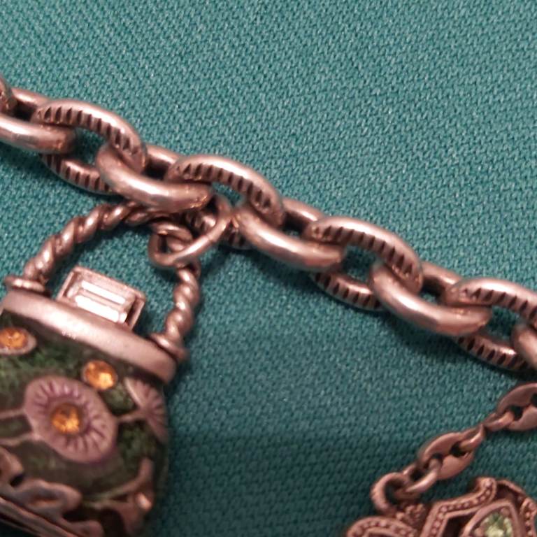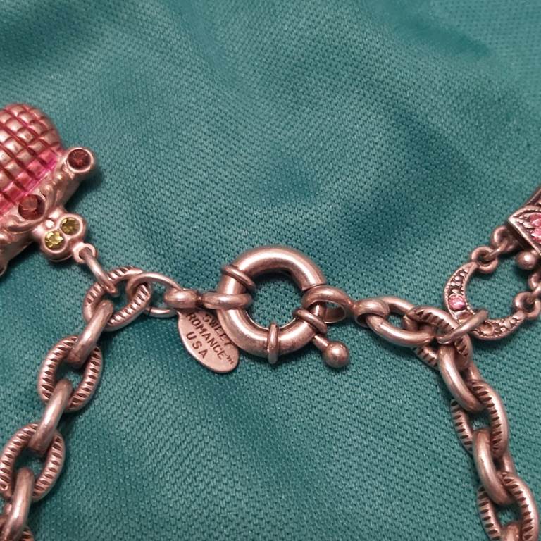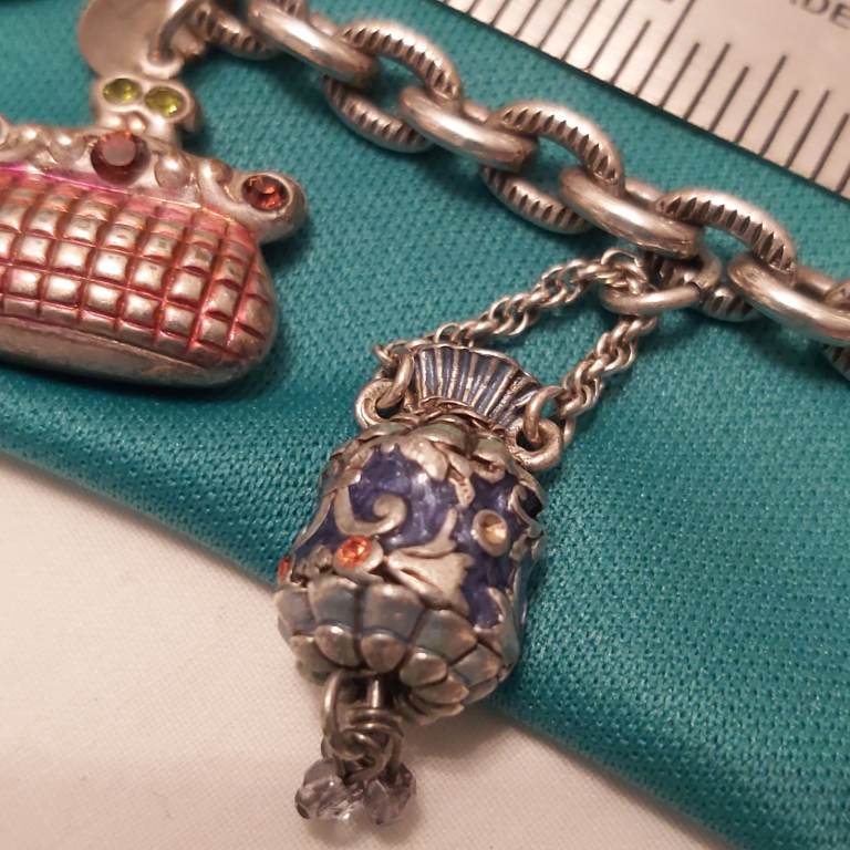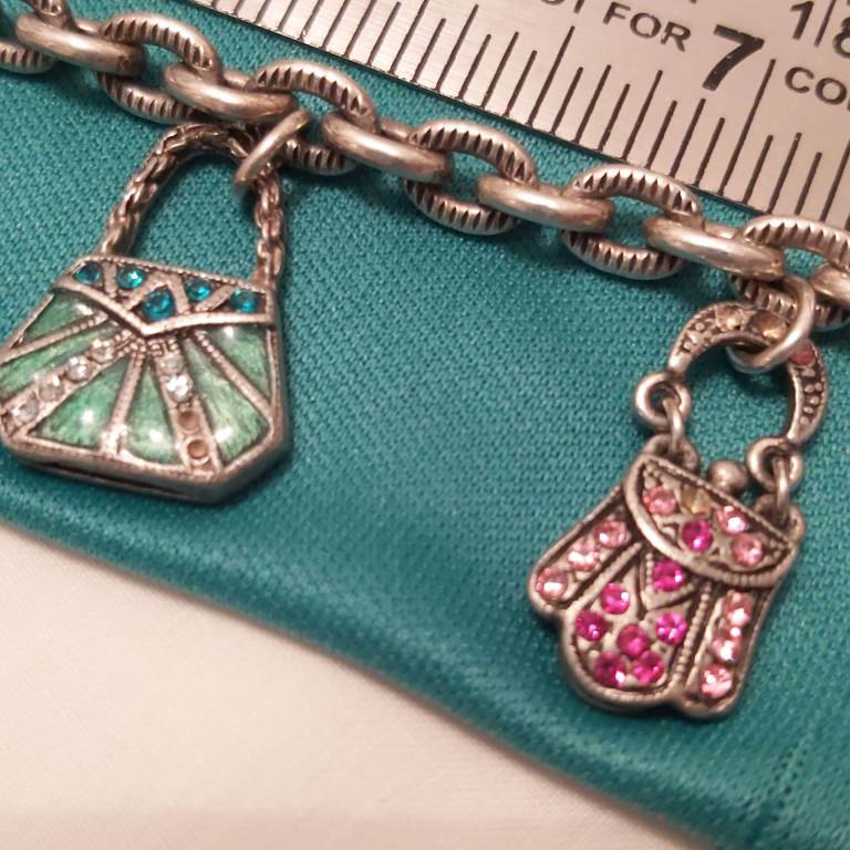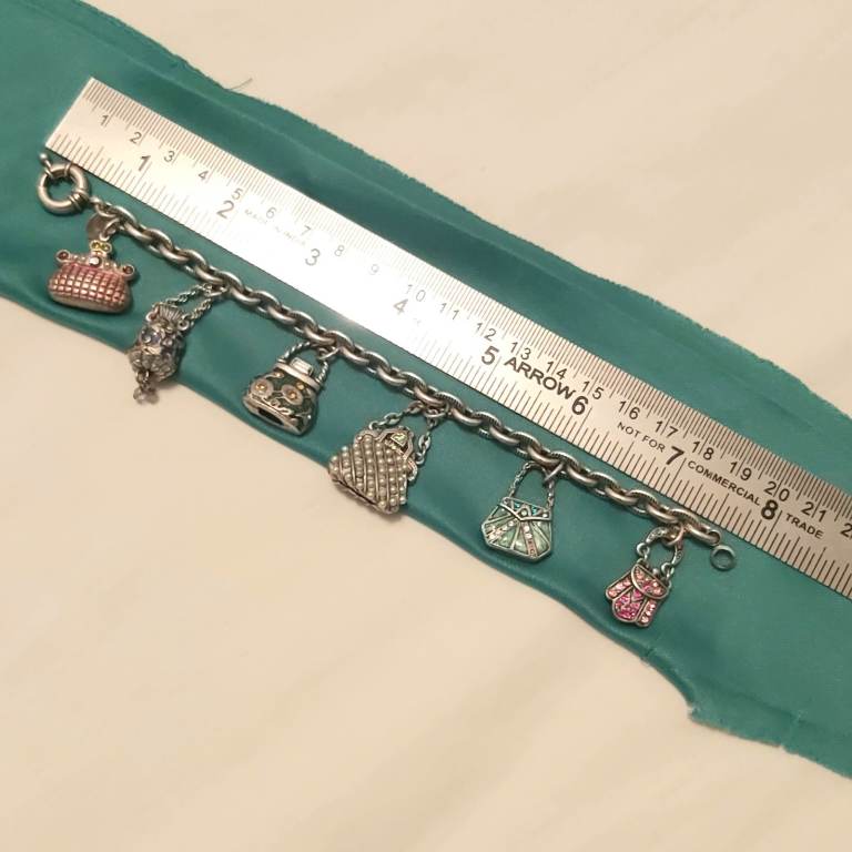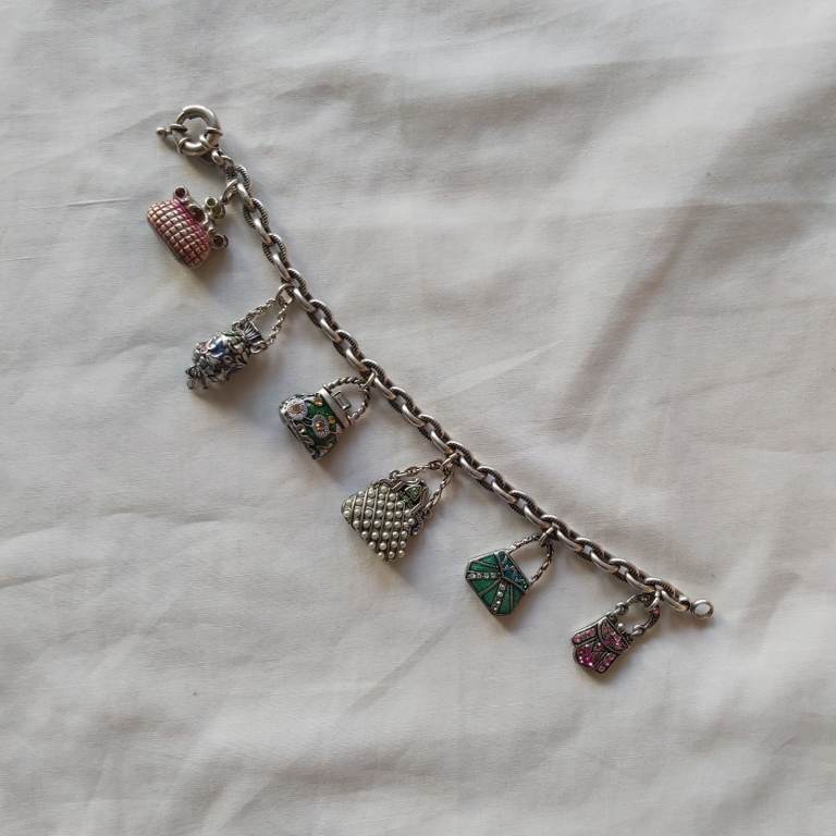 Beautiful Sweet Romance charm bracelet made in the USA with 6 charms of vintage handbags each uniquely embellished, some with semi-precious stones.