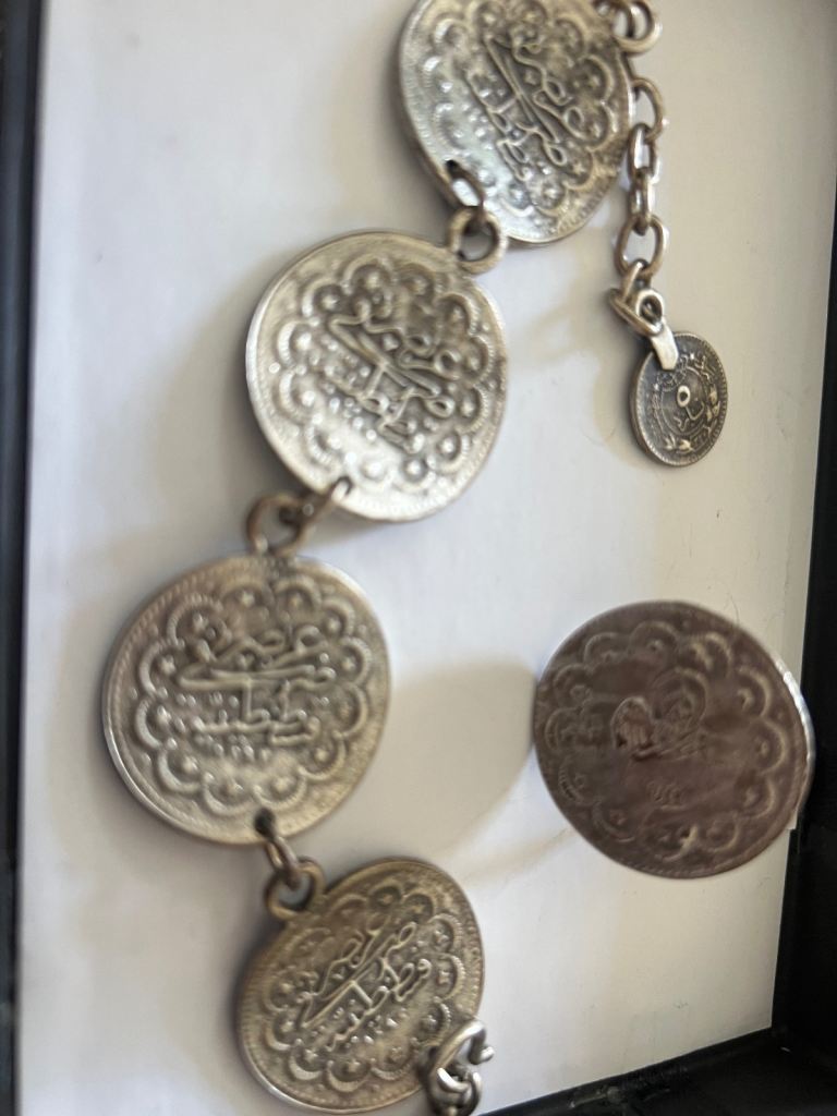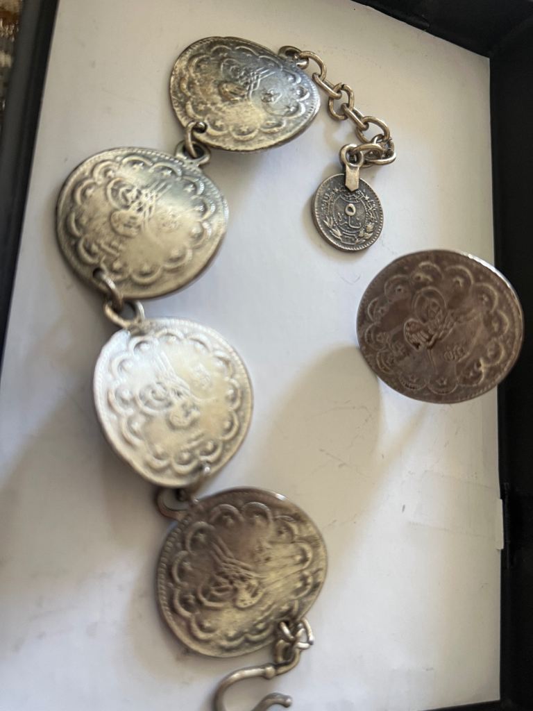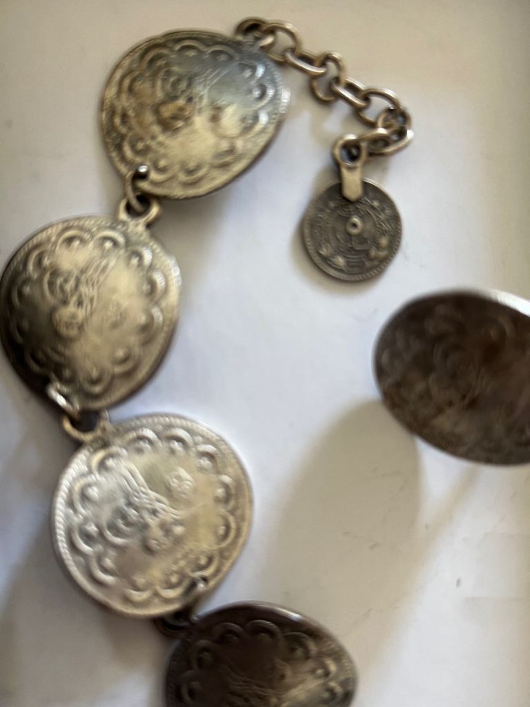 Concho vintage coin silver bracelet and ring. From turkey. It has a Turkish design on the coins. Total weight of the bracelet is 30.5 g. It’s an antique silver coin bracelet. No time wasters please.