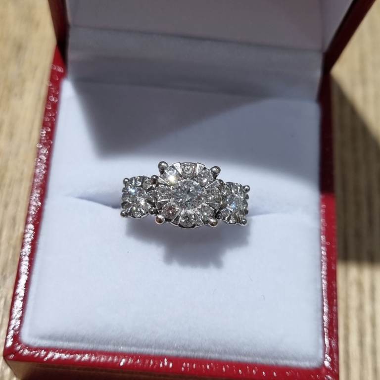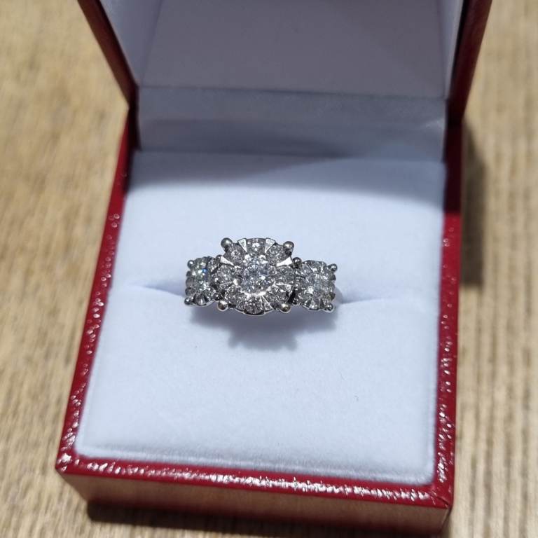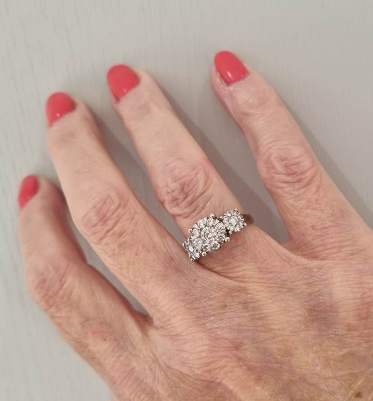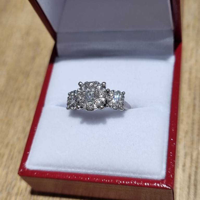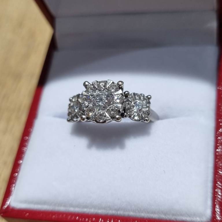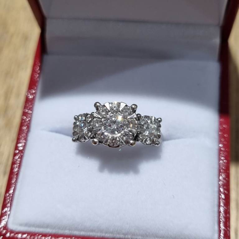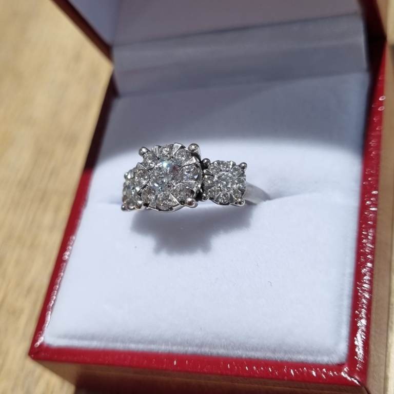Beautiful impressive modern 18ct marked white gold Diamond triple cluster ring. Featuring 3 round clusters with 27 quality natural white, clean, sparkly round brilliant cut diamonds. Total diamond weight of 1.00ct, as stamped in the shank. Weighs a nice 4.7gms and a finger size approx J. In excellent condition and comes in a presentation box. Postage available. Please view my other jewellery.