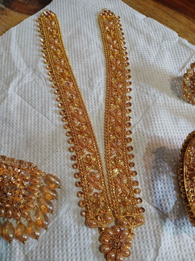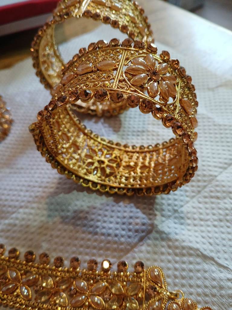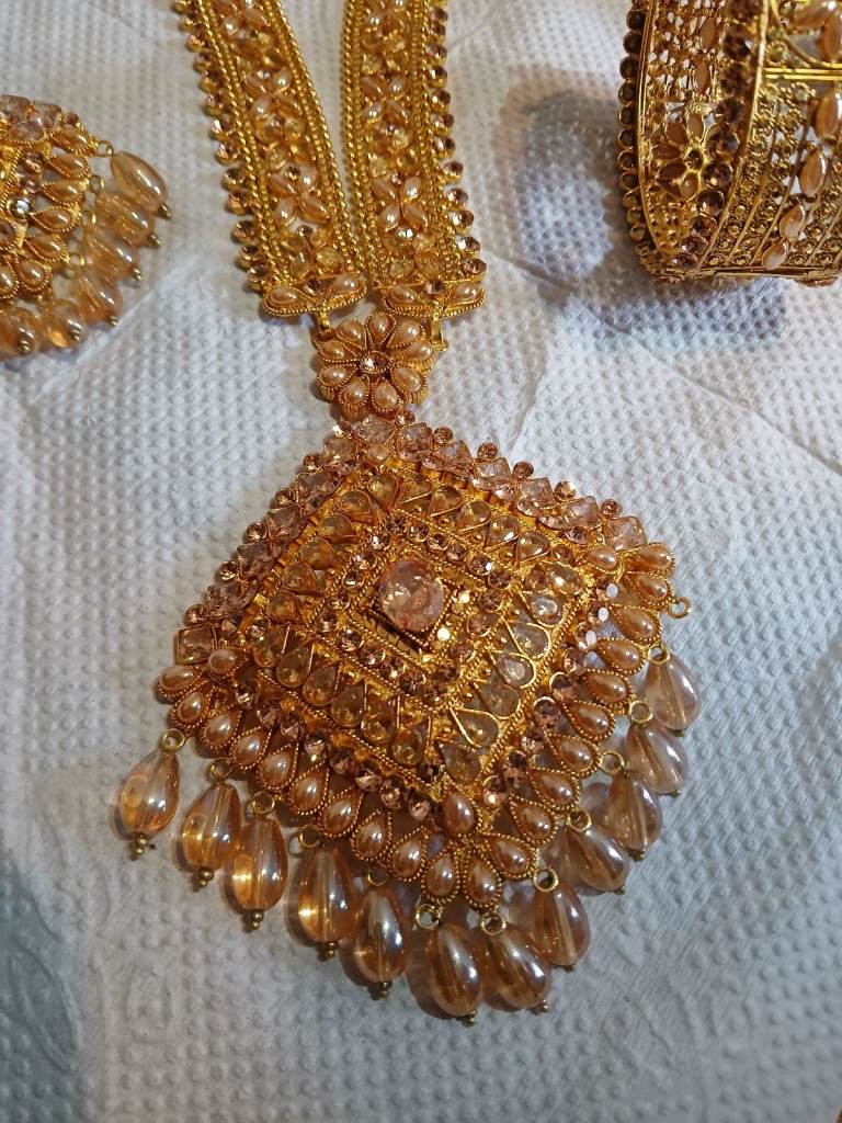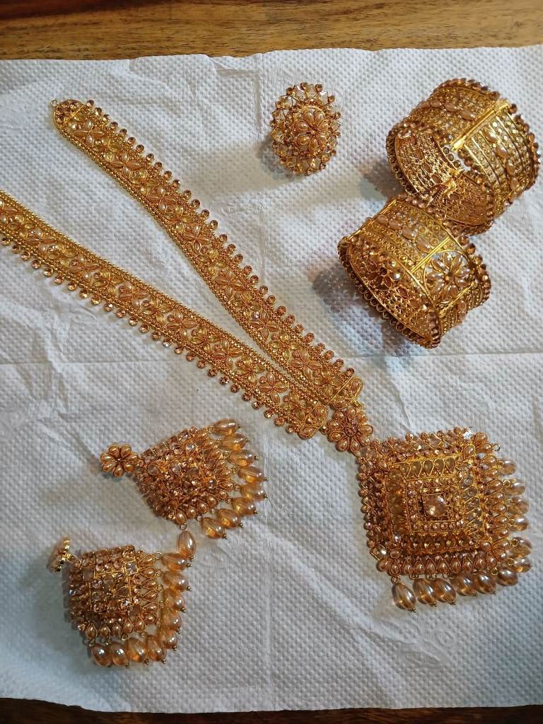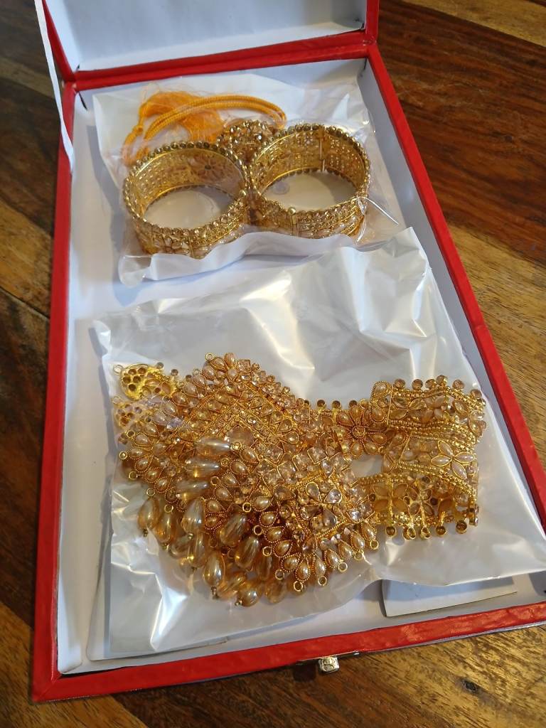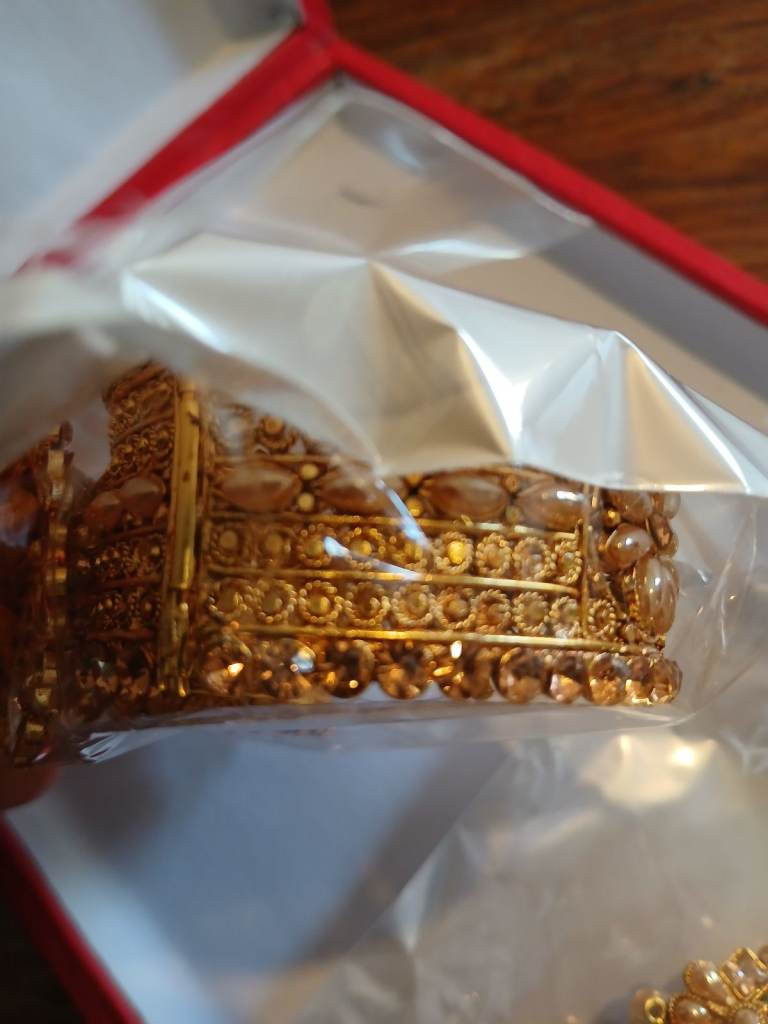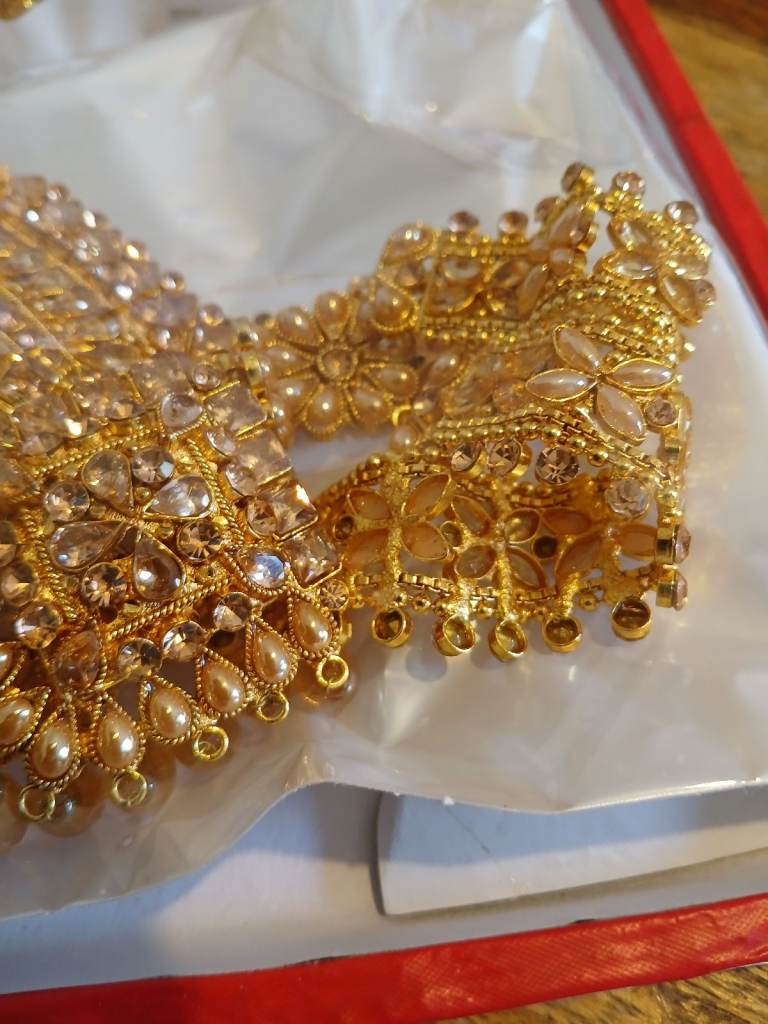 Exquisite set of plated gold jewelry featuring intricate floral and geometric designs. Set consists of bracelets, earrings, necklace and ring. Very good quality, brand new in original packaging. Comes complete with presentation box. WAS £150. NOW £80. Delivery available.