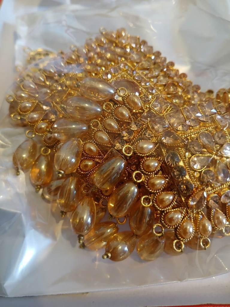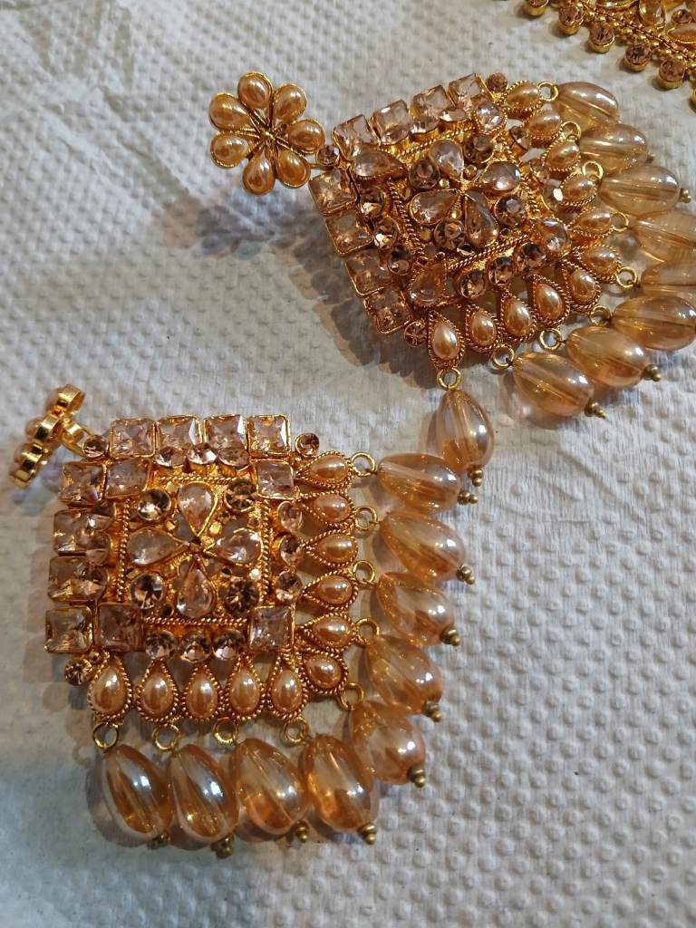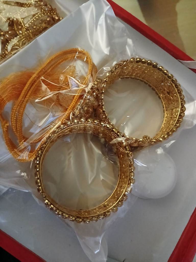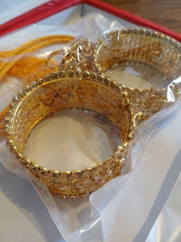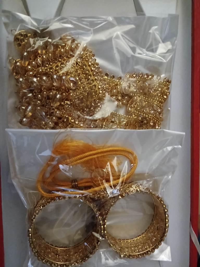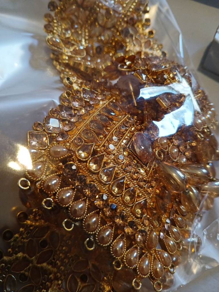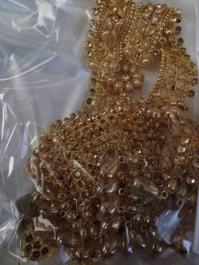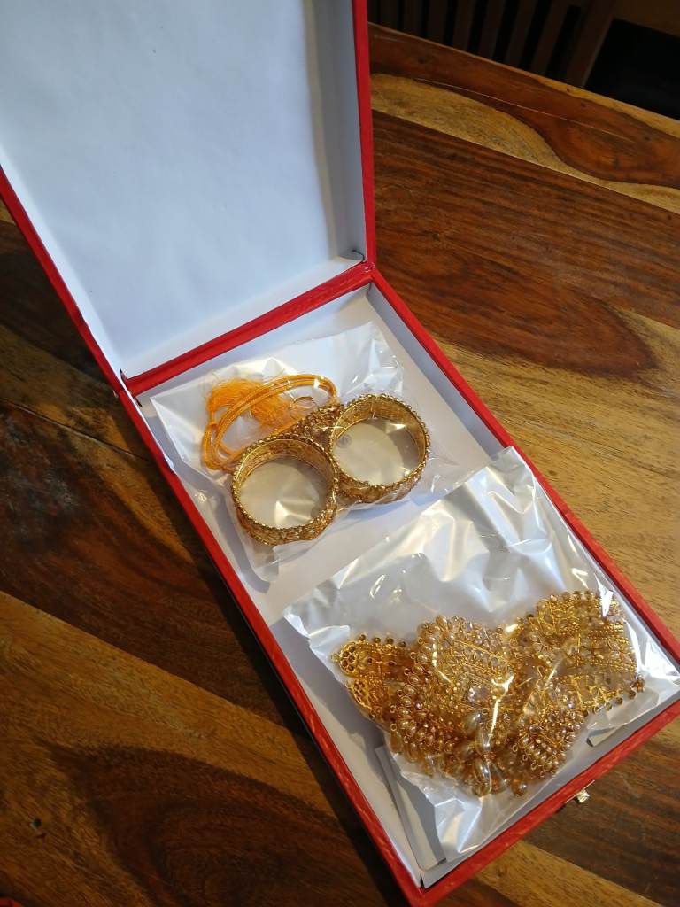 Exquisite set of plated gold jewelry featuring intricate floral and geometric designs. Set consists of bracelets, earrings, necklace and ring. Very good quality, brand new in original packaging. Comes complete with presentation box. WAS £150. NOW £80. Delivery available.