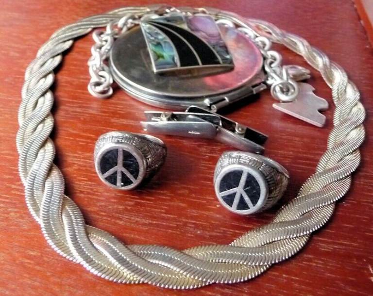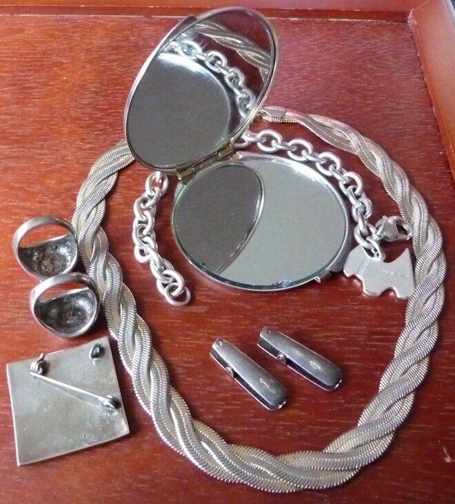 For sizing assistance, the necklace is approx. 16 inches / 40cms long, The POLA compact is approx. 6cms in diameter and the unusual rings are UK sized at N. The metal brooch has an enamel face. Any markings are clearly incidental to the items and are not definitive of their sourcing. TRACKED 48 postage can be as little as £4.05.. EVRI also available.
