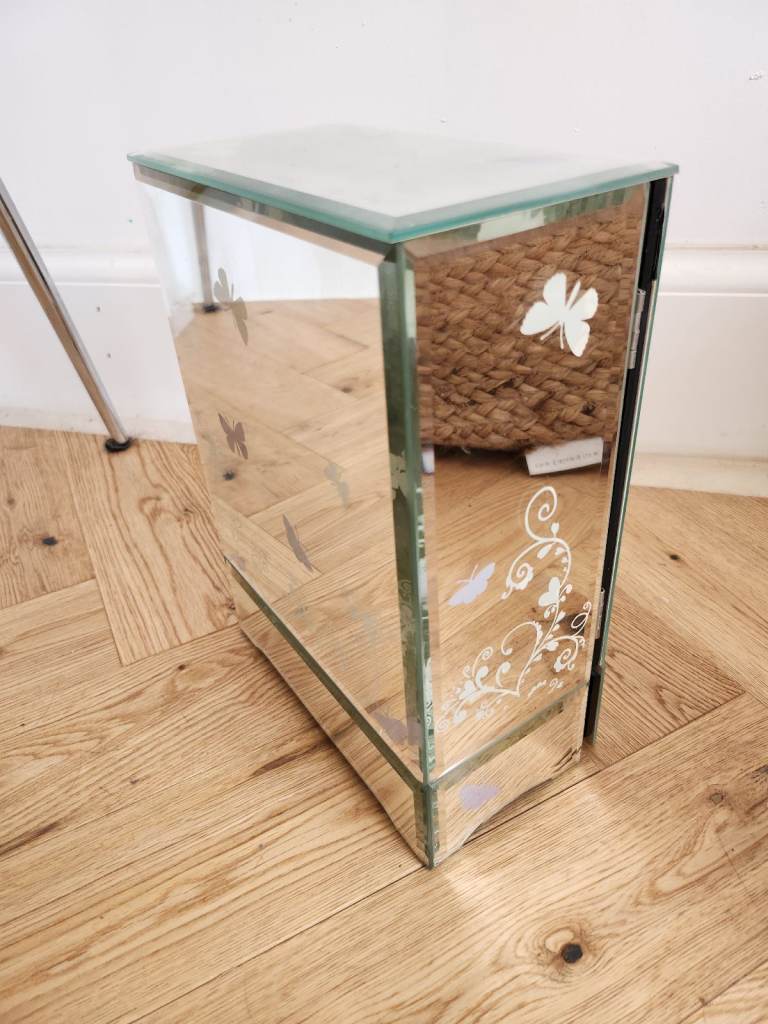 Mirrored butterfly jewellery wardobe box. With velvet lined drawer and extendable metal hangers for necklaces earrings ect. Mirrored all around with floral and butterfly print. Is fairly heavy and needs to be handled with care. Collection only