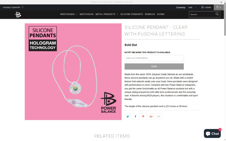 23" Length, surgical strength silicone cord and pendant with 2 PowerBalance holograms, clear with Fuchsia writing, one size fits all, easily stretches over the head, suitable for men or women, brand new in sealed box.