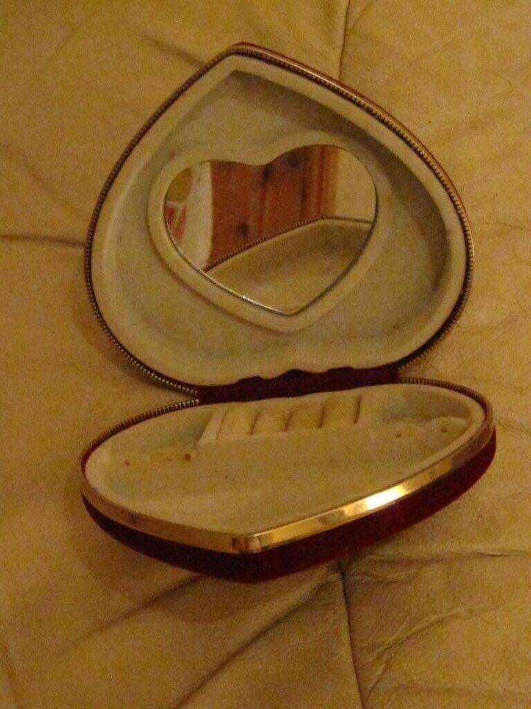 Pretty Burgundy velour & gold trim Heart shaped Jewelry box with Mirror