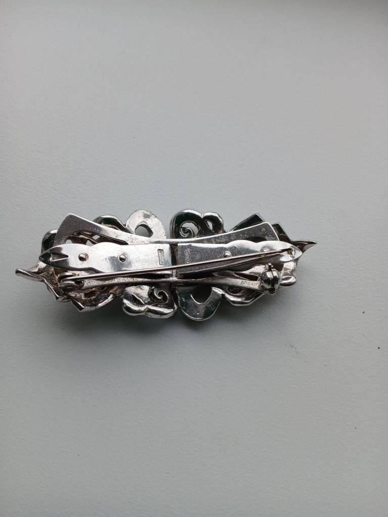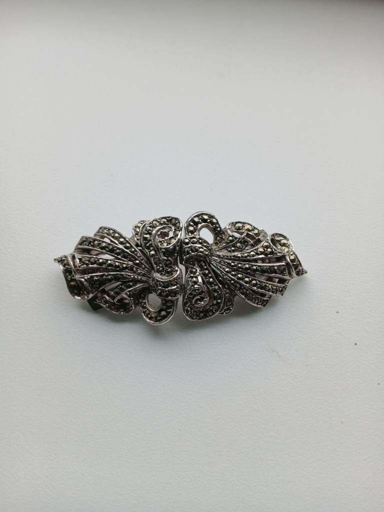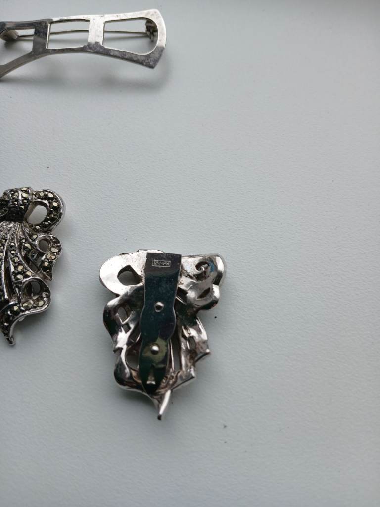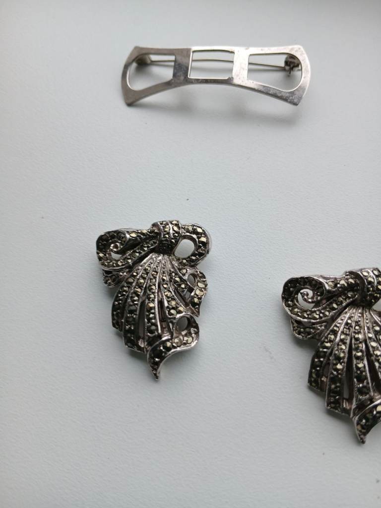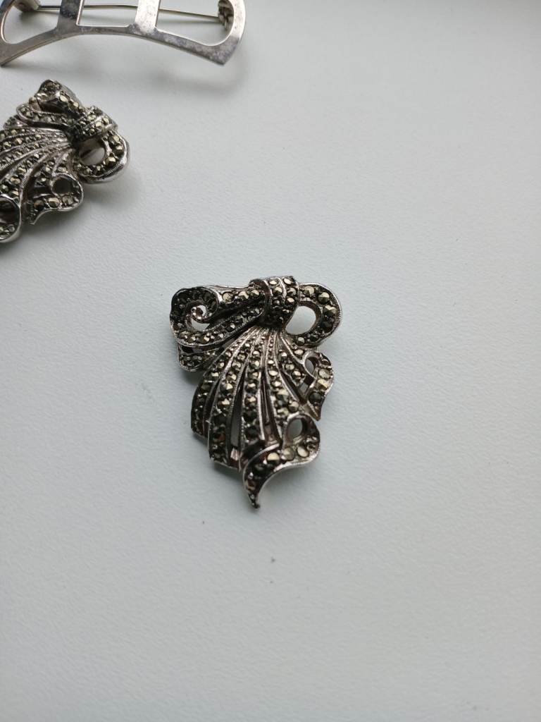 This unusual piece appears like a brooch but can come apart and make two dress pins or clip on earrings. Marcasite