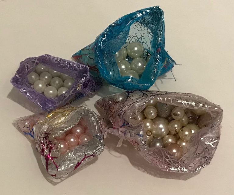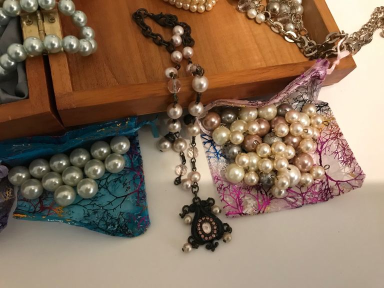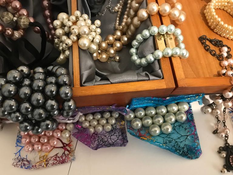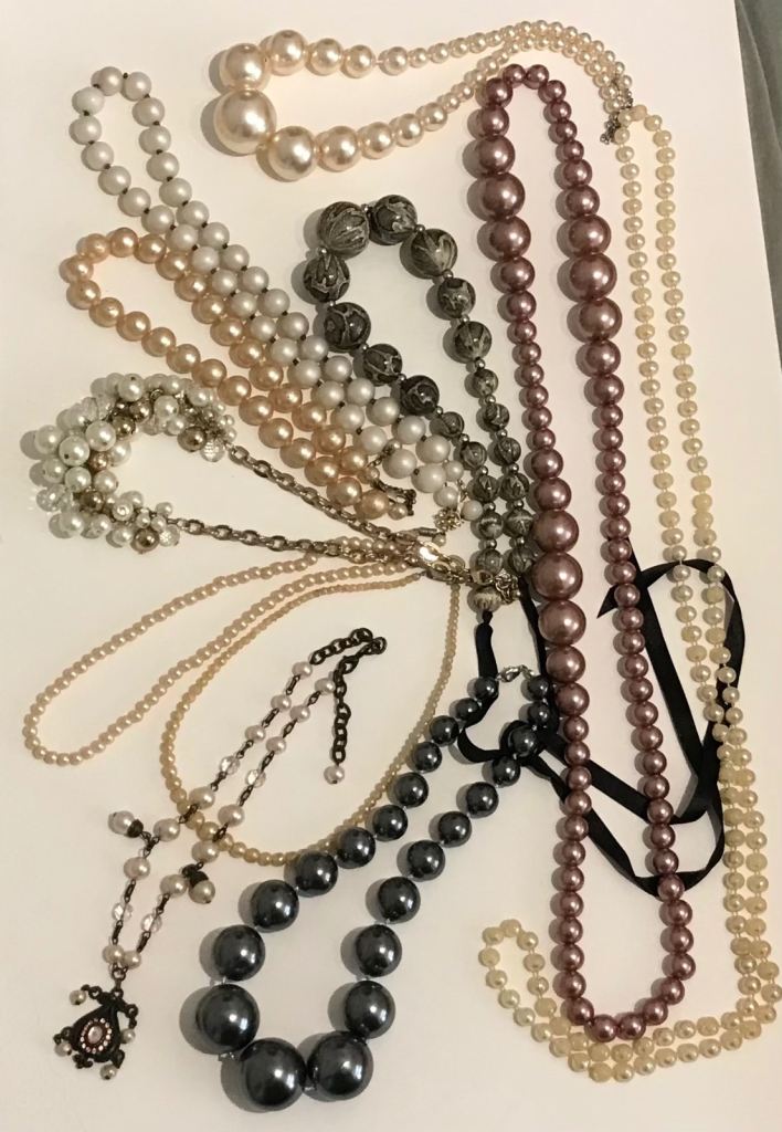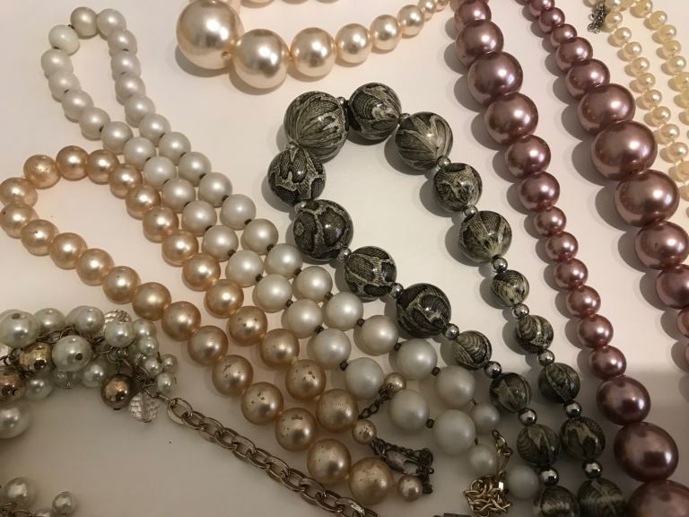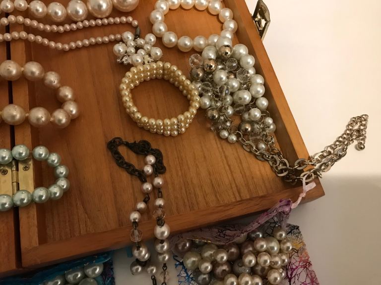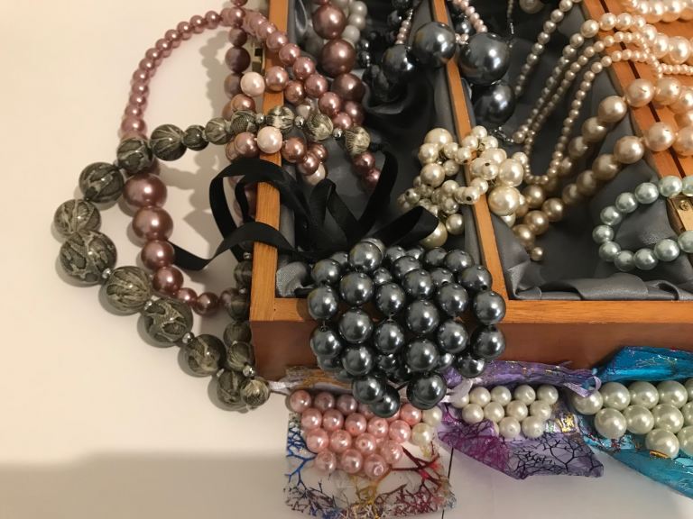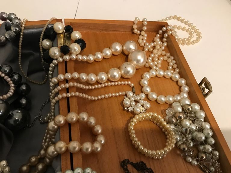 This job lot includes a beautiful large wooden box lined with grey satin, (see measurements in close up photos), containing a large variety of vintage pearly beads necklaces, bracelets, 1 brooch, and a few small organza bags containing various groups of pearlescent beads.