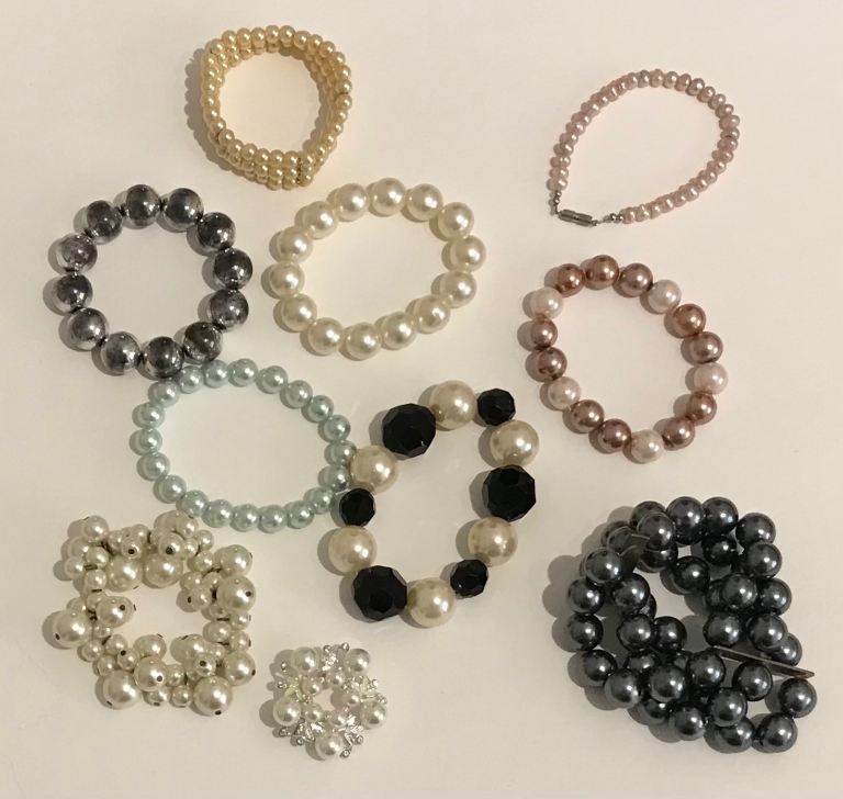 The lot consists of a diverse range of sizes and colours, with various pearlescent shades of white, cream, yellow, pink, powder blue, silver, grey, and 1 snake skin patterned, (see photos), to suit any taste, style, or occasion. The majority are ready to wear as they are, and the others can be dismantled to be used in making new items or in other crafty projects.