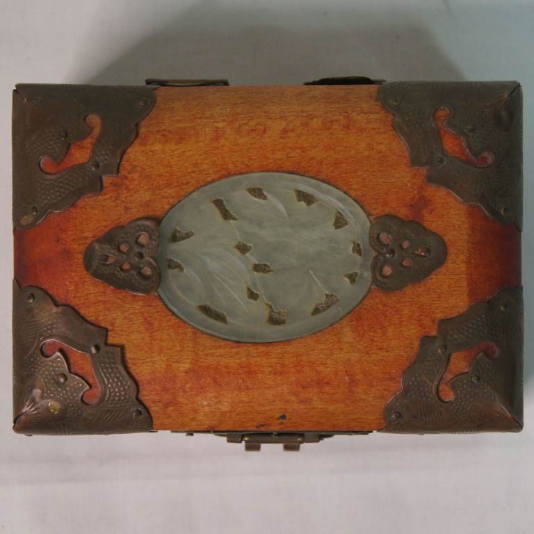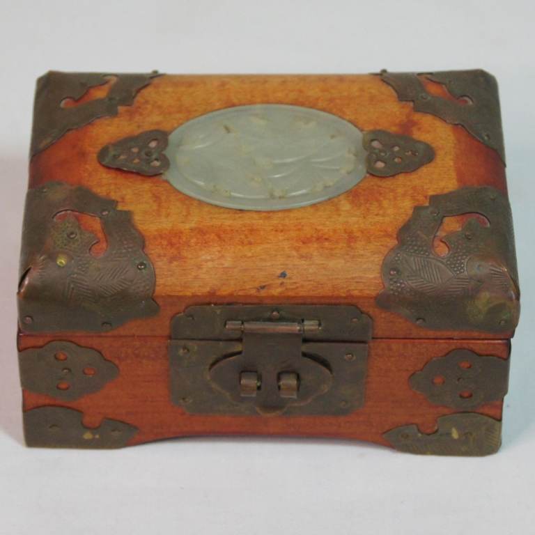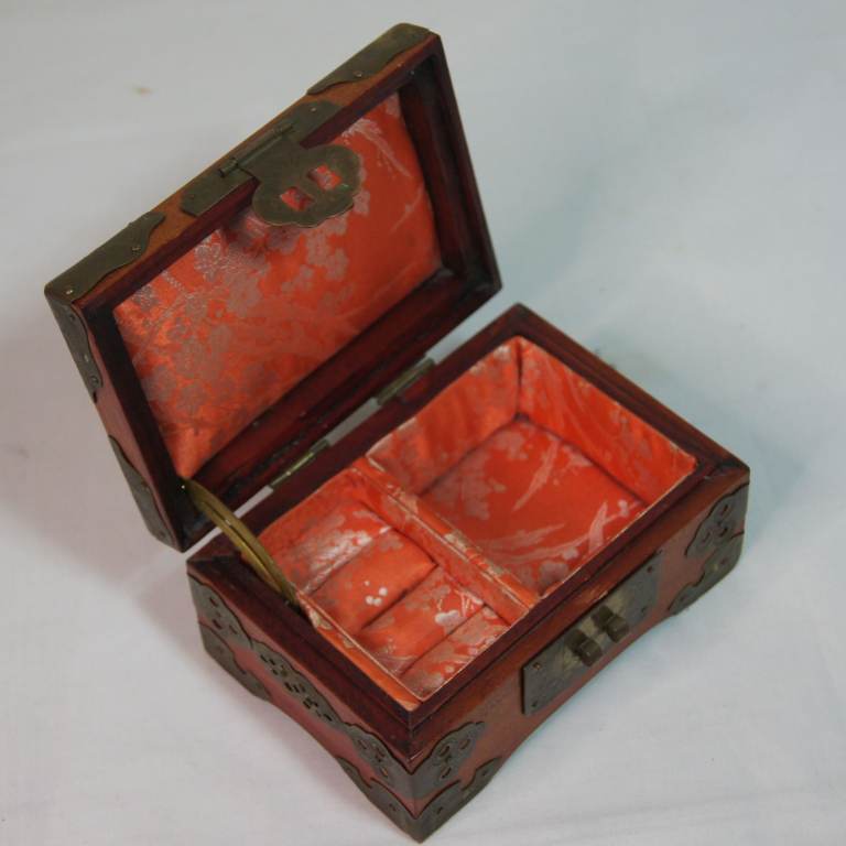 Small Vintage Chinese Jewellery Box Casket with Brass Fittings and Carved Insert