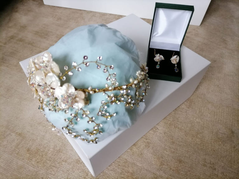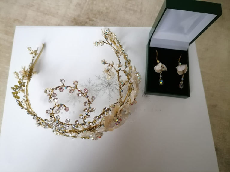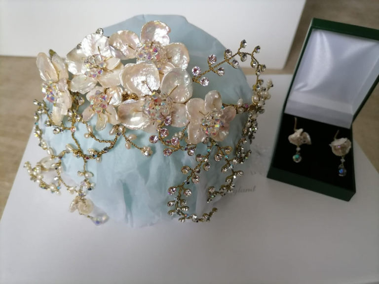 Handmade in England - Swarovski crystals, Pearls and Pearl shells tiara + earrings by Helen Morris-Clarke Designs.